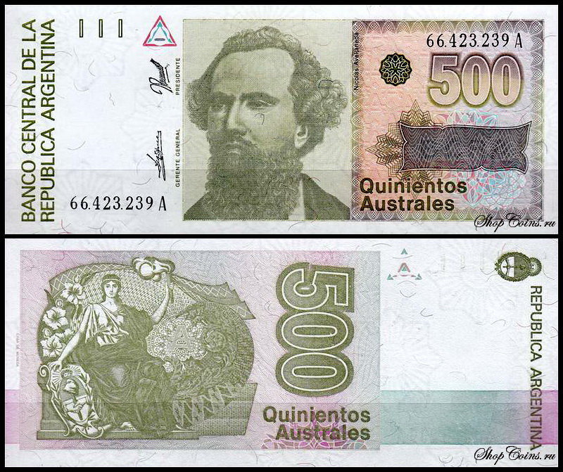 Аргентина 500 аустралей 1990 (UNC Pick 328b) 500 оливкового цвета