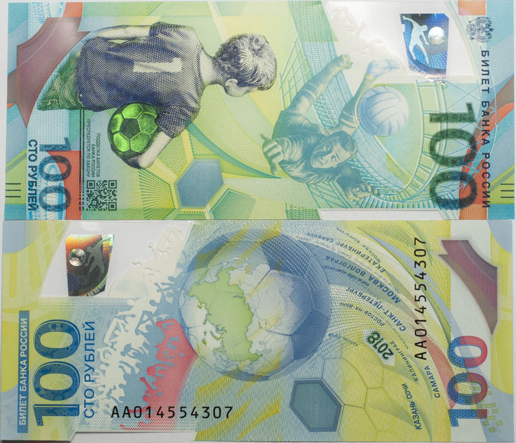 Купюра 100 рублей 2018 ЧМ по футболу FIFA 2018 в России серии АА