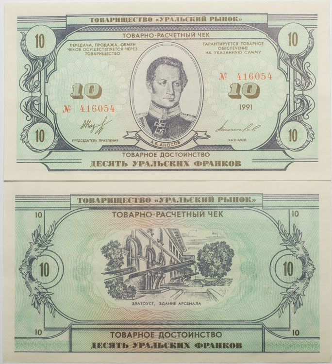 Купюра 10 Уральских франков 1991