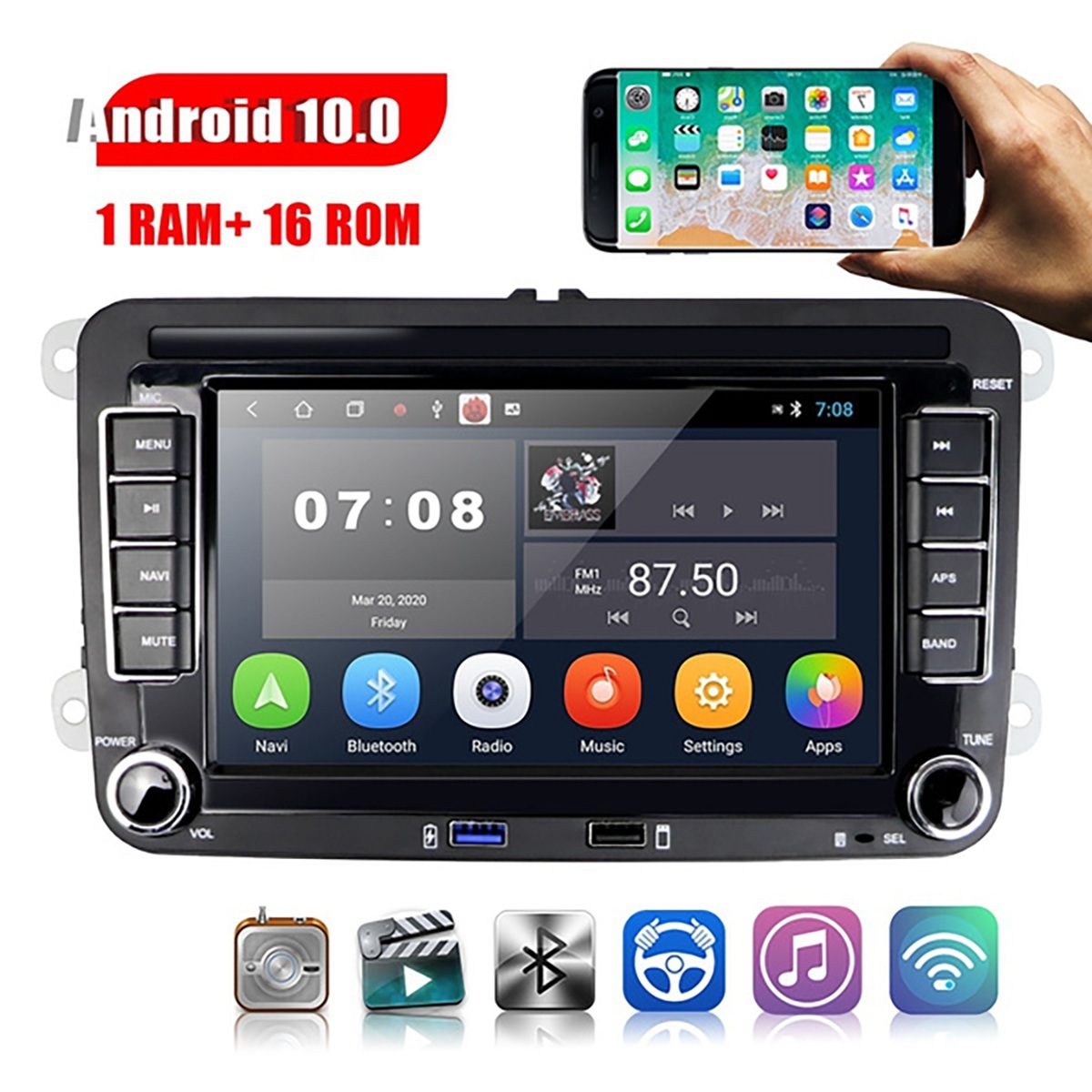 Android 10.0 Автомобильные стереодинамики 7-дюймовые контактные экраны CAR MP5 Bluetooth WiFi GPS зарядки USB порт FM-радиоприемник 1 + 16G