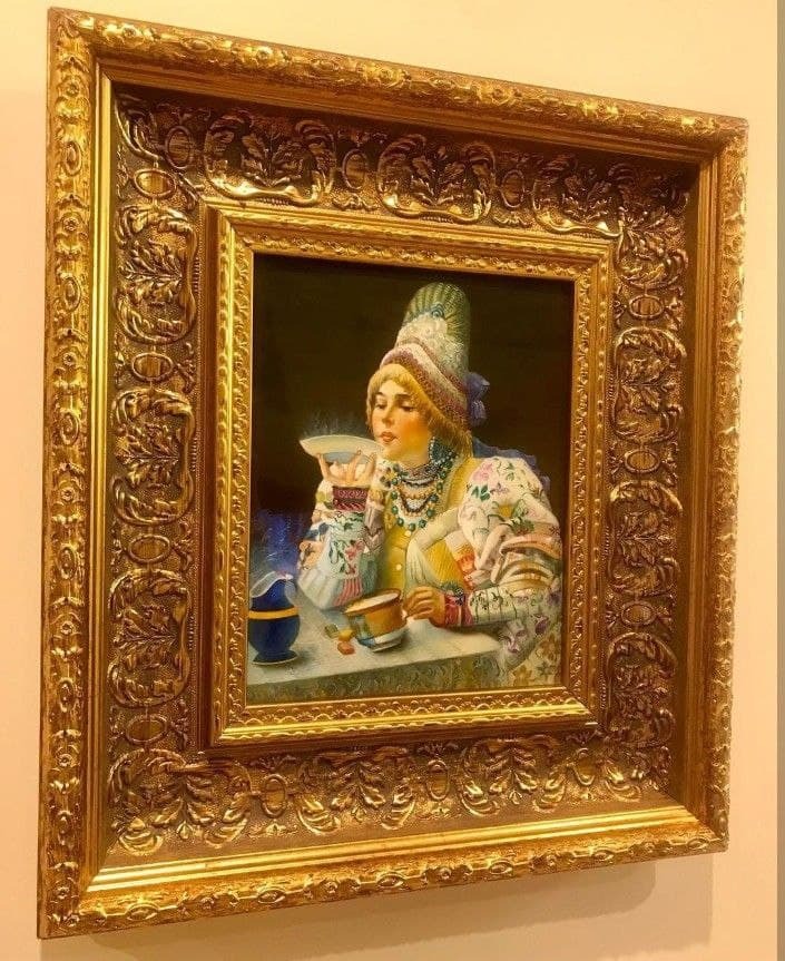 Картина панно лаковая миниатюра из папье маше За чаем / масляная живопись / ручная работа