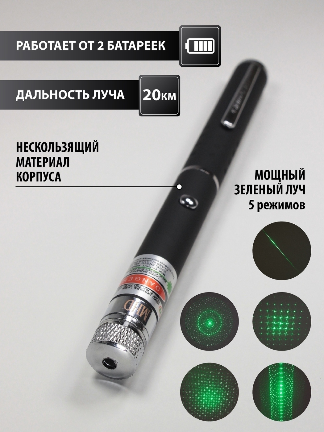 Лазерная указка "Зеленый луч" (Green laser pointer Lr 014) + 4 насадки