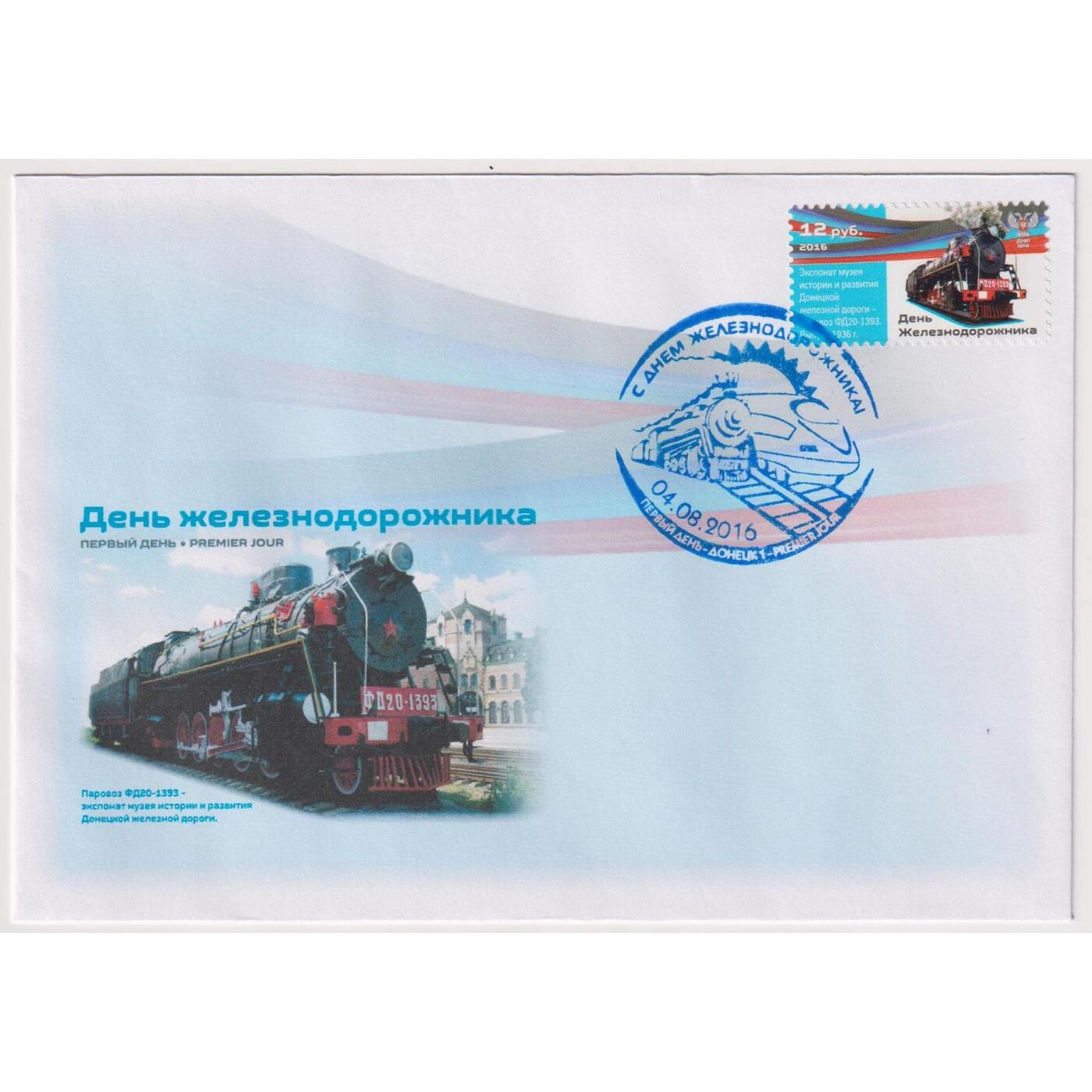Конверт первого дня (КПД) ДНР 2016г. "День железнодорожника" Поезда, Локомотивы