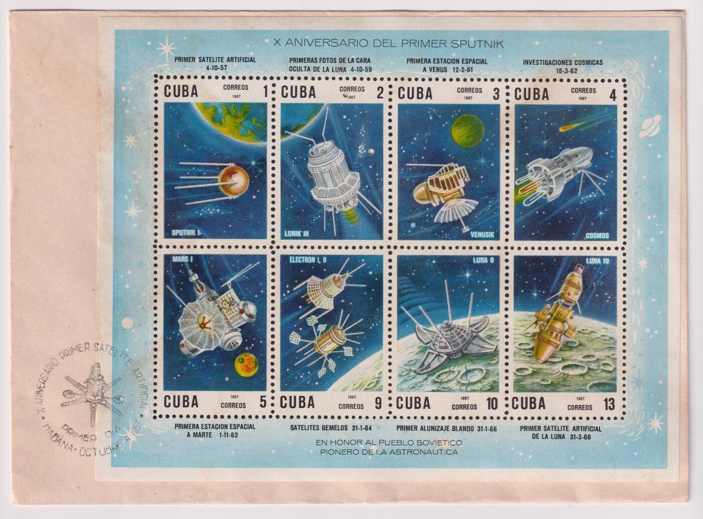 Конверт первого дня (КПД) Куба 1967г. "10-летие запуска искусственных космических спутников" Космос