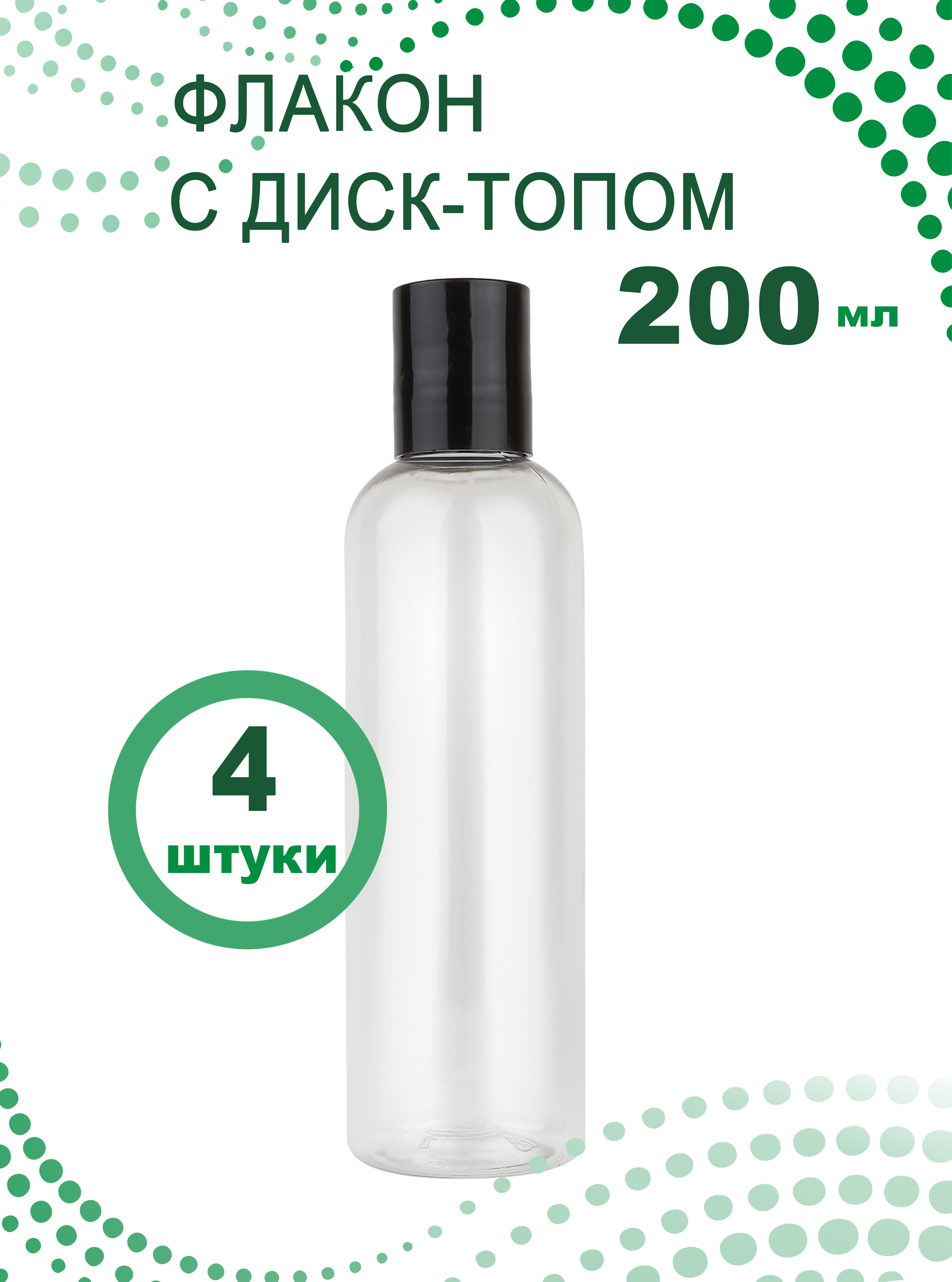 Флакон 200 мл прозрачный с черной крышкой диск-топ, 4 шт.