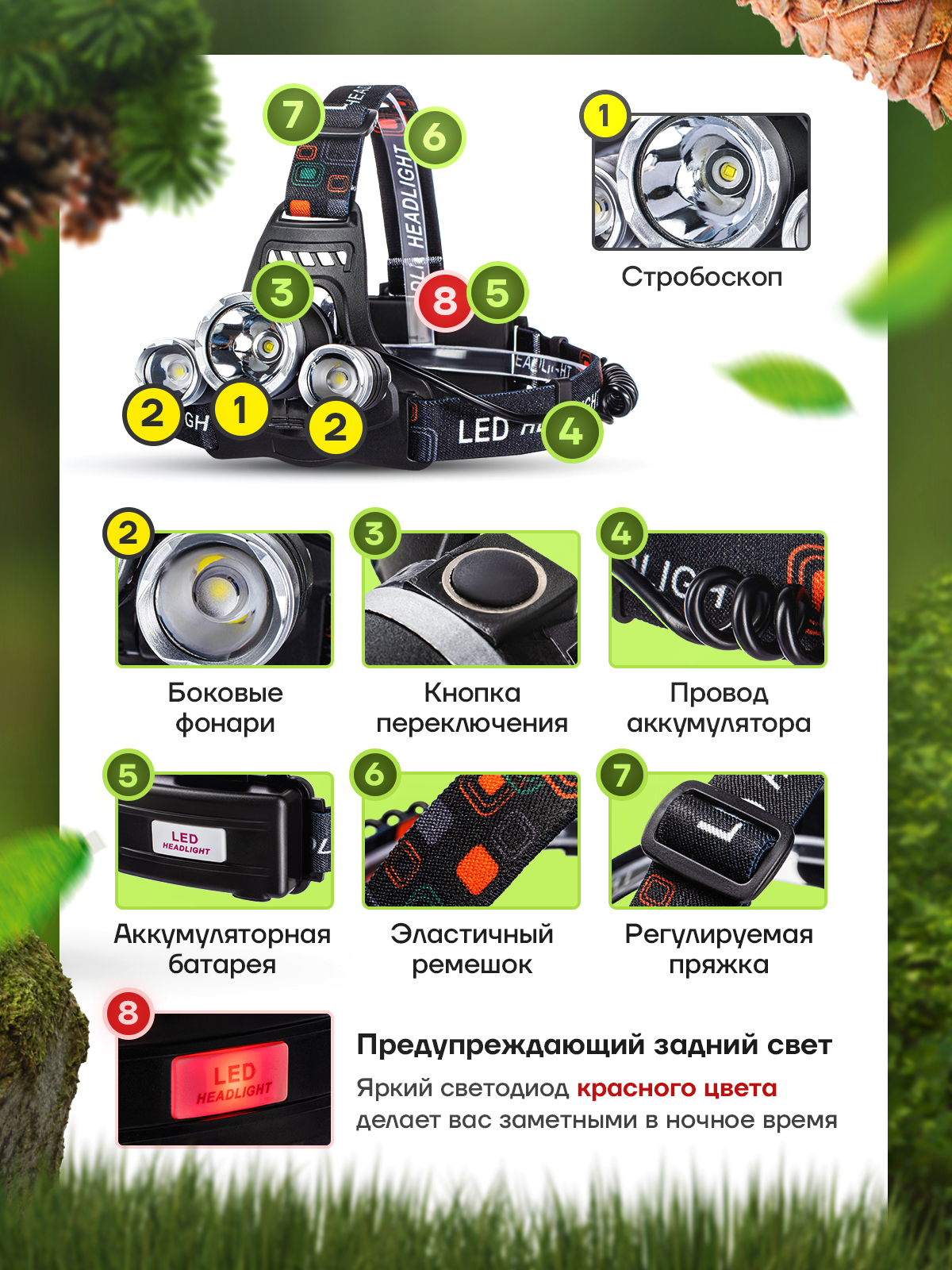 Фонарь тройной налобный LED Headlight, аккумуляторный