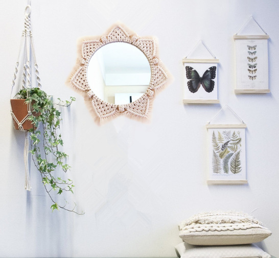 Гобелен из макраме настенное декоративное зеркало Богемия (белый)
