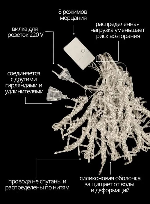Электрогирлянда новогодняя Занавес ForLife Светодиодная 320 ламп, 3 на 2 м, питание От сети 220В, От сети 220В