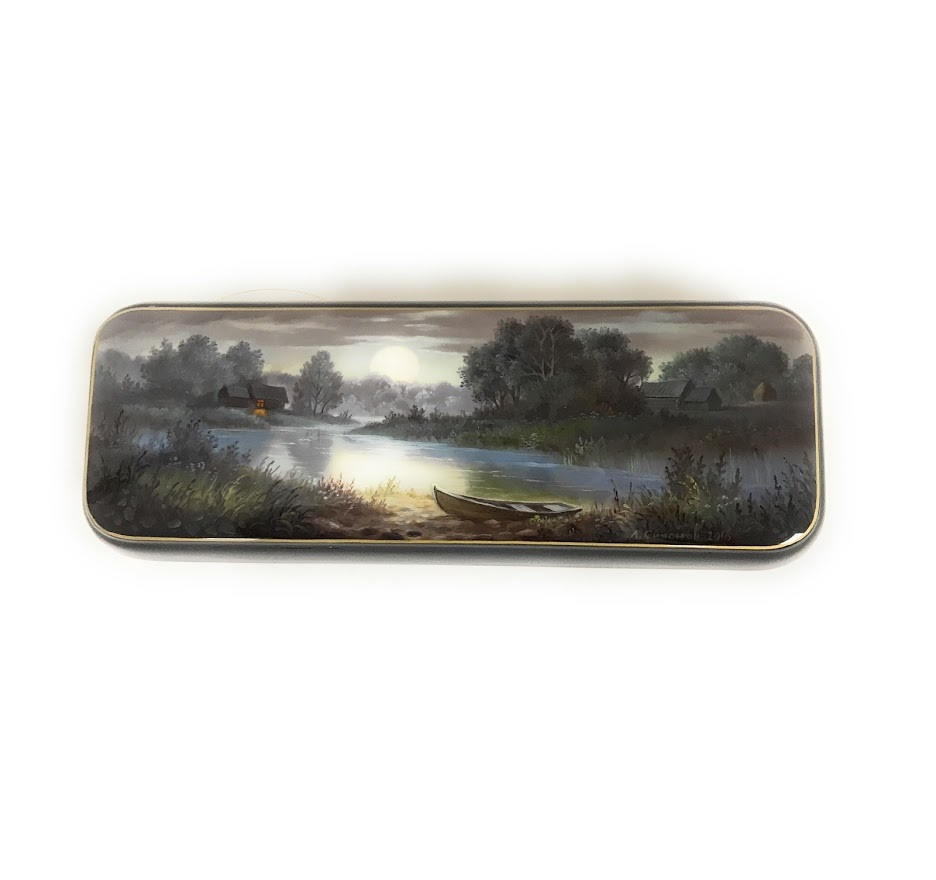 Шкатулка с лаковой миниатюрой Зимний пейзаж - дом и река / Ручная роспись