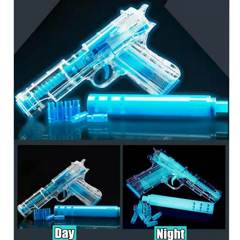 Игрушечный пистолет синего цвета со светящейся пружиной, стреляющий мягкими пулями