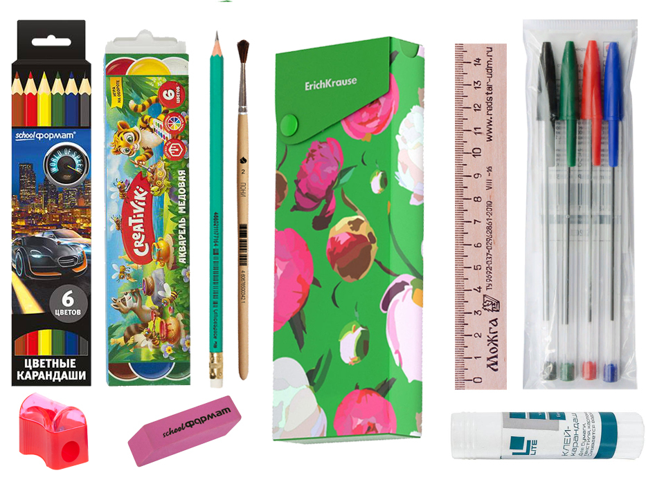 Набор школьника первоклассника ОДИССЕЙ 12+1 предметов в пластиковом пенале ErichKrause ПИОНЫ