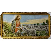 Гобелен "Иисус и стадо овец", 60x120 см. Картина нитями с люрексом золотой багет (рамка)