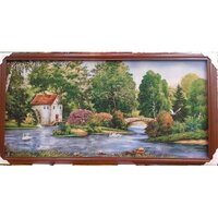 Гобелен "Лебеди, озеро, дом", 60x120 см. Картина нитями в коричневом багете (рамка)