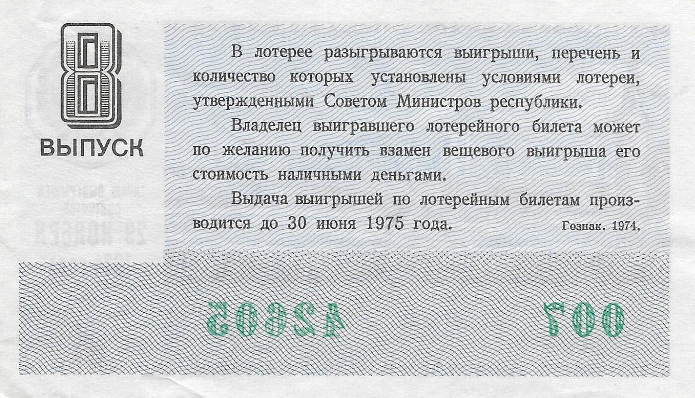 Билет денежно-вещевой лотереи 1974 г. 8 выпуск.