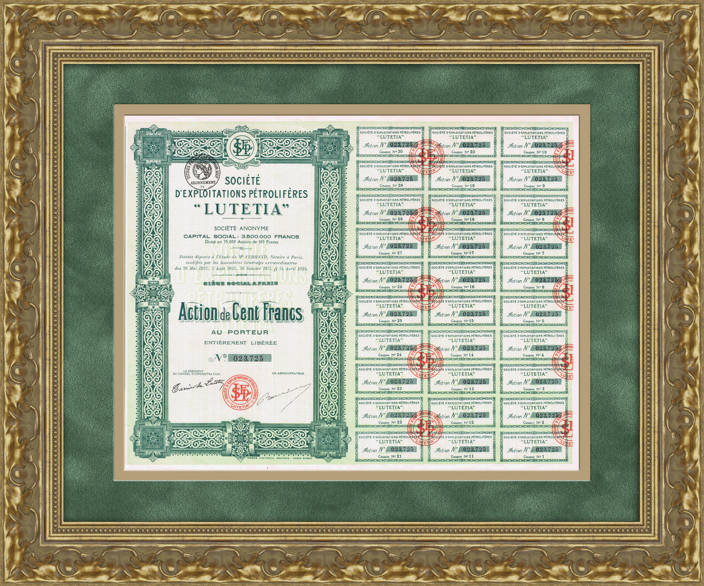 Нефтепереработка, акция французской компании Lutetia на 100 франков, с полным купонным листом