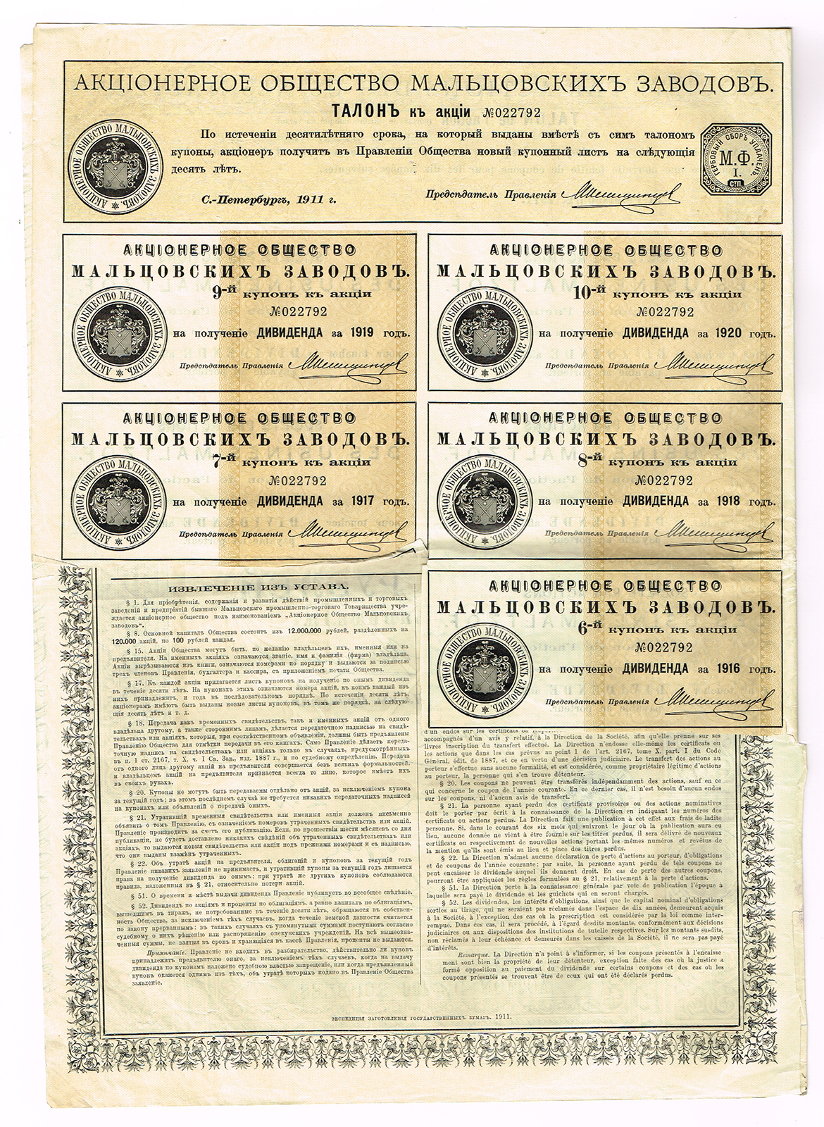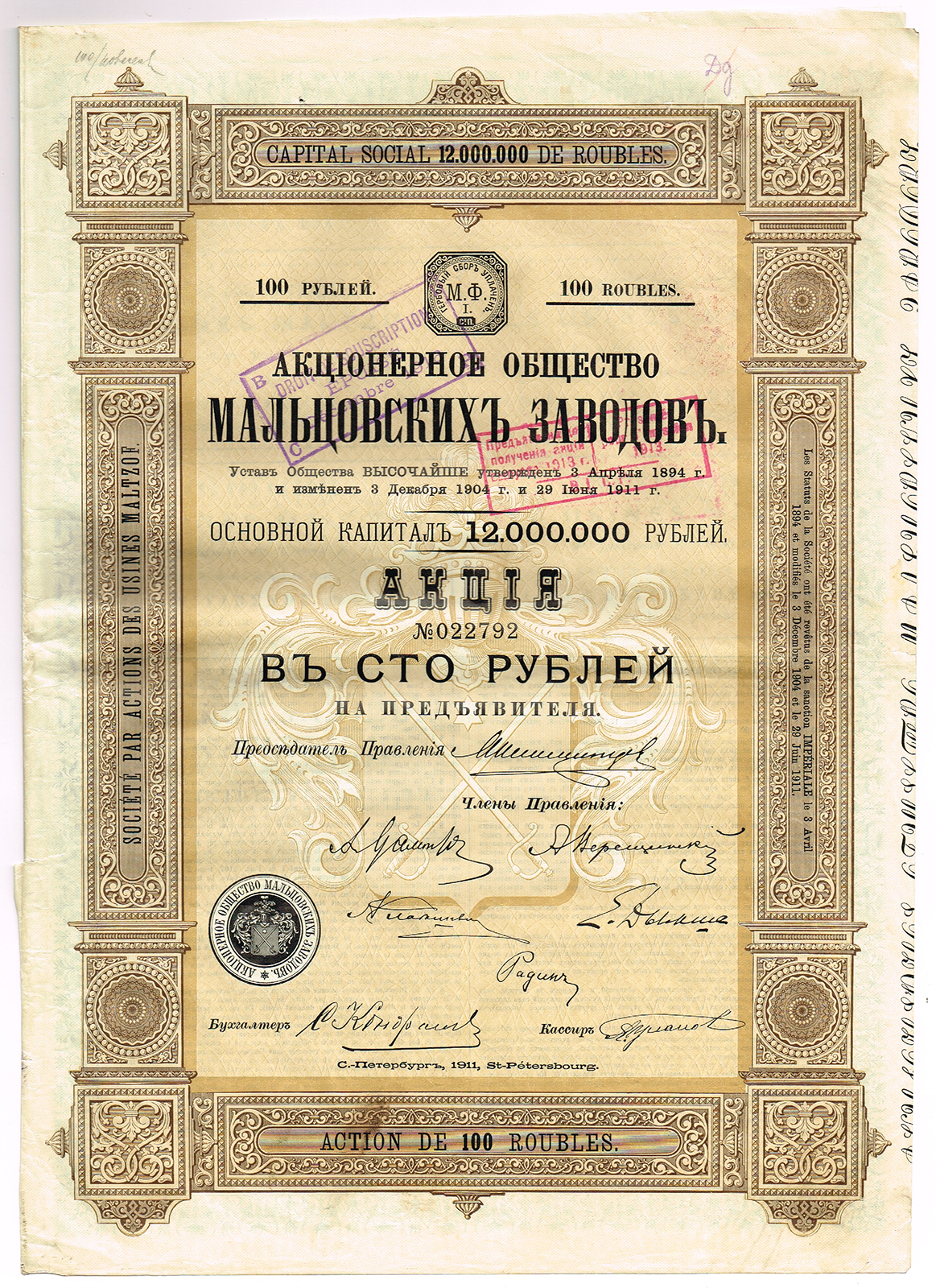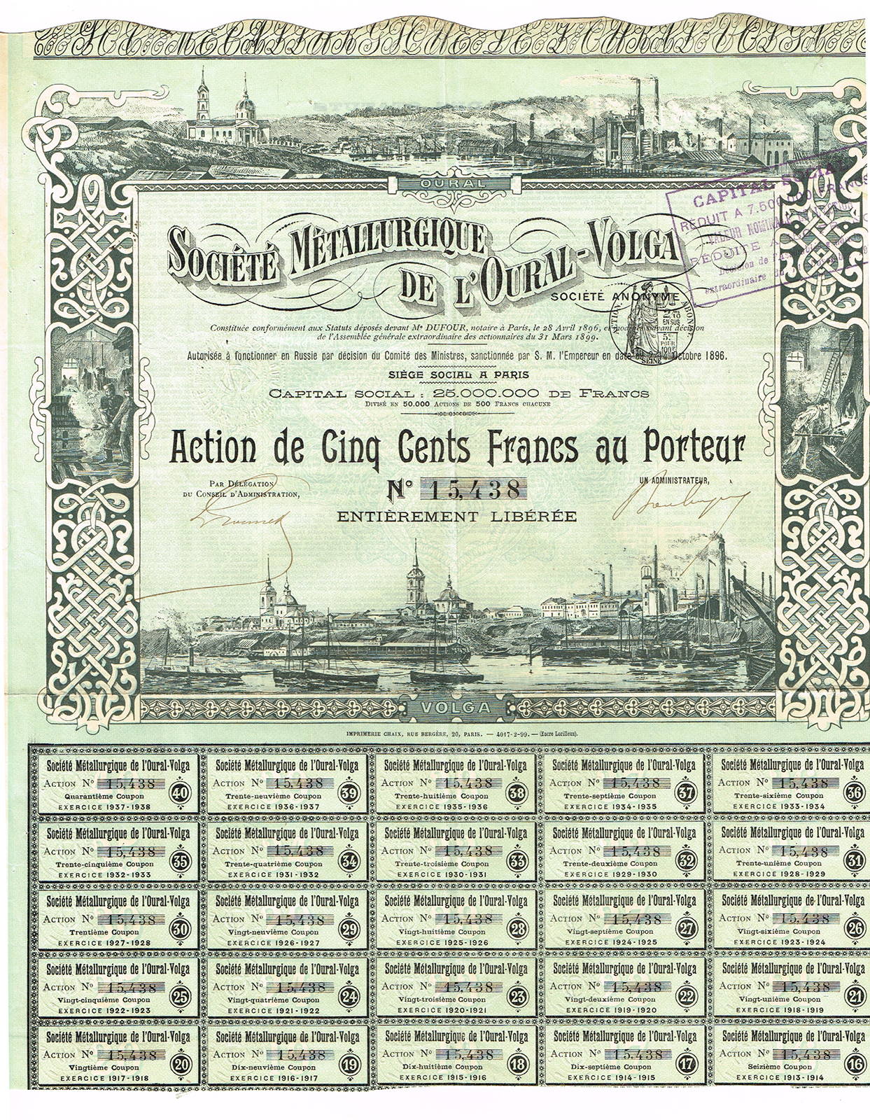 Учредительская акция частного промышленного, коммерческого, колониального банка Лион-Марсель