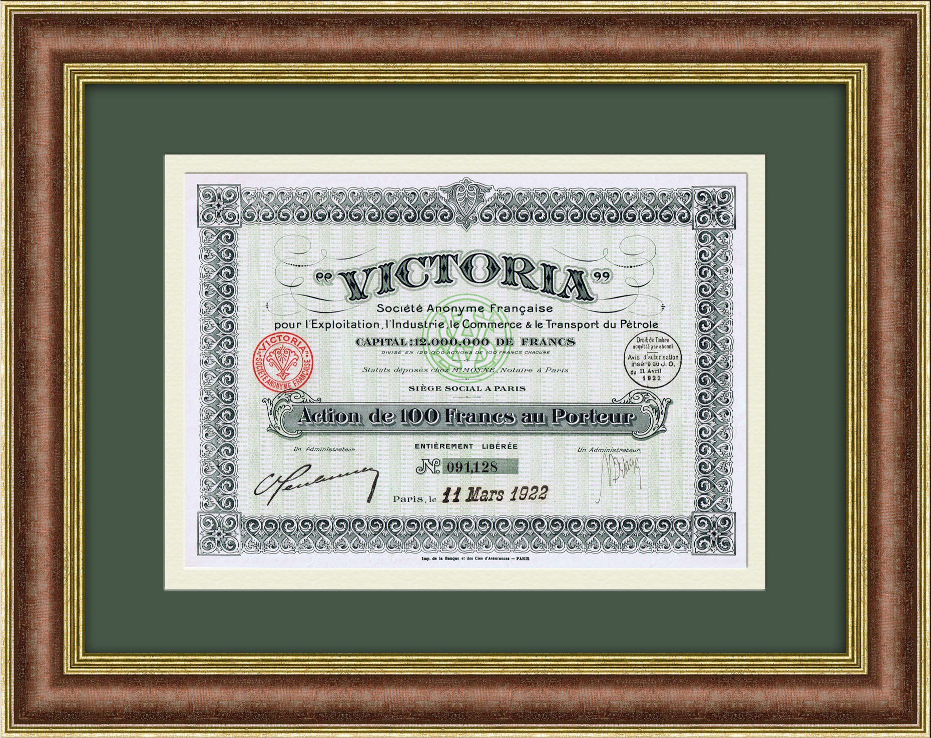 Транспортировка нефти, французская компания Victoria, акция на 100 франков 1922 года