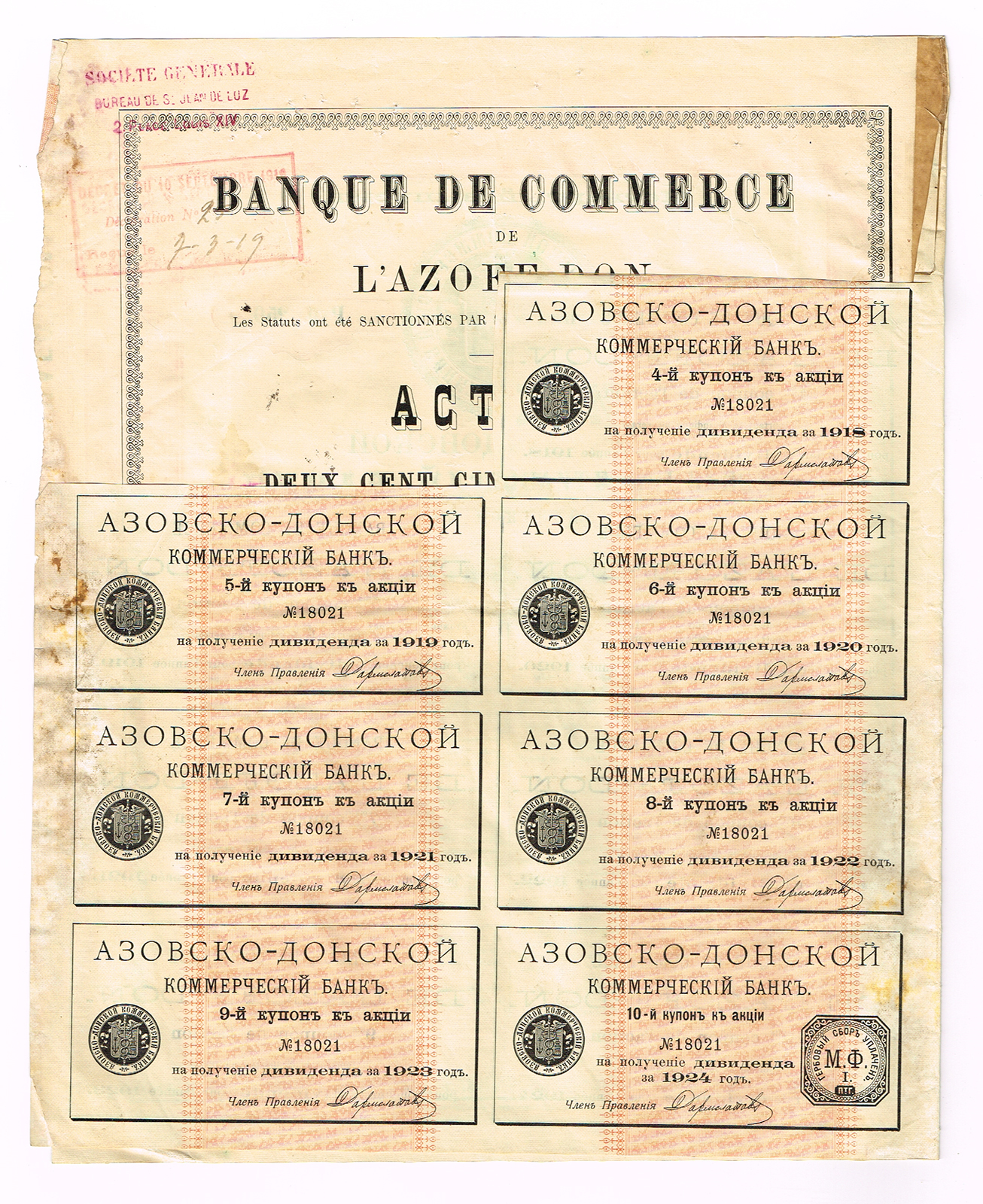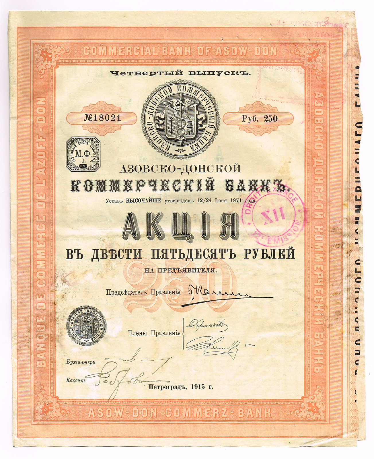 Ценная бумага Акция в 250 рублей. Азовско-Донской Коммерческий Банк. 4 выпуск. С купонами. № 18021. Российская Империя, 1915 год