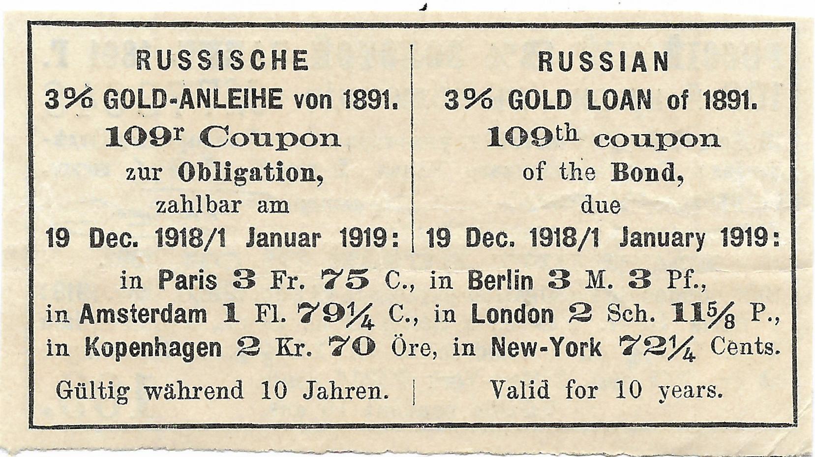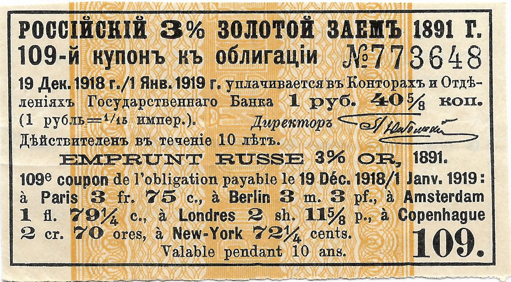 Купон облигации Российского 3% золотого займа 1891 г. на сумму 1 руб. 40 5/8 коп.