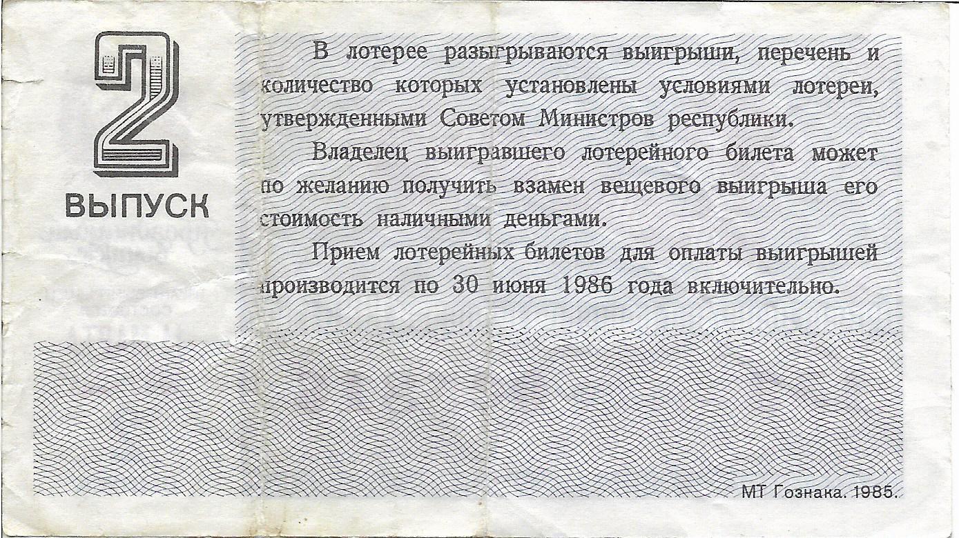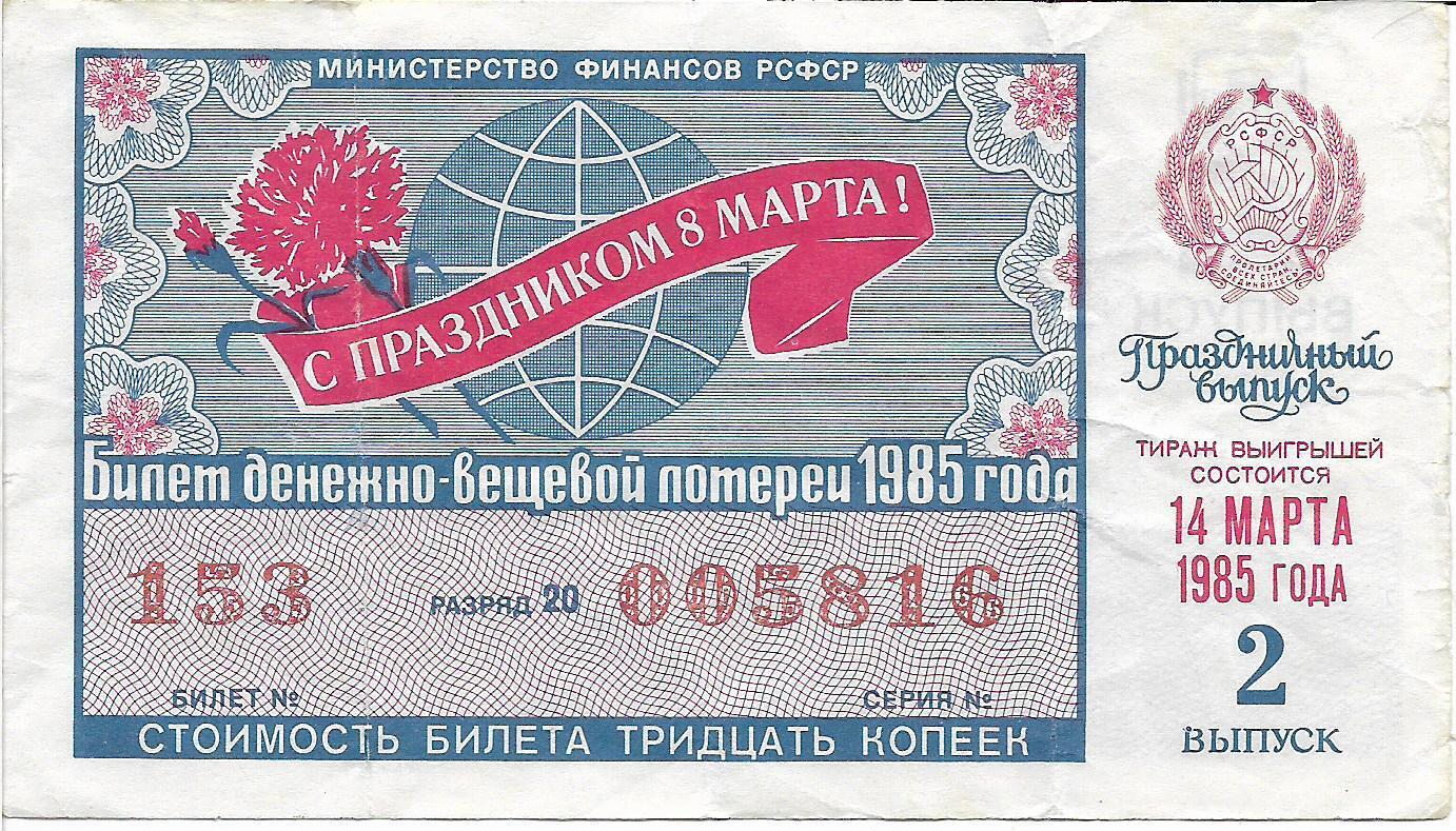 Билет денежно-вещевой лотереи 1985 г. Праздничный выпуск.