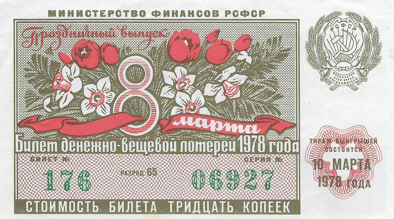 Билет денежно-вещевой лотереи 1978 г. Праздничный выпуск.