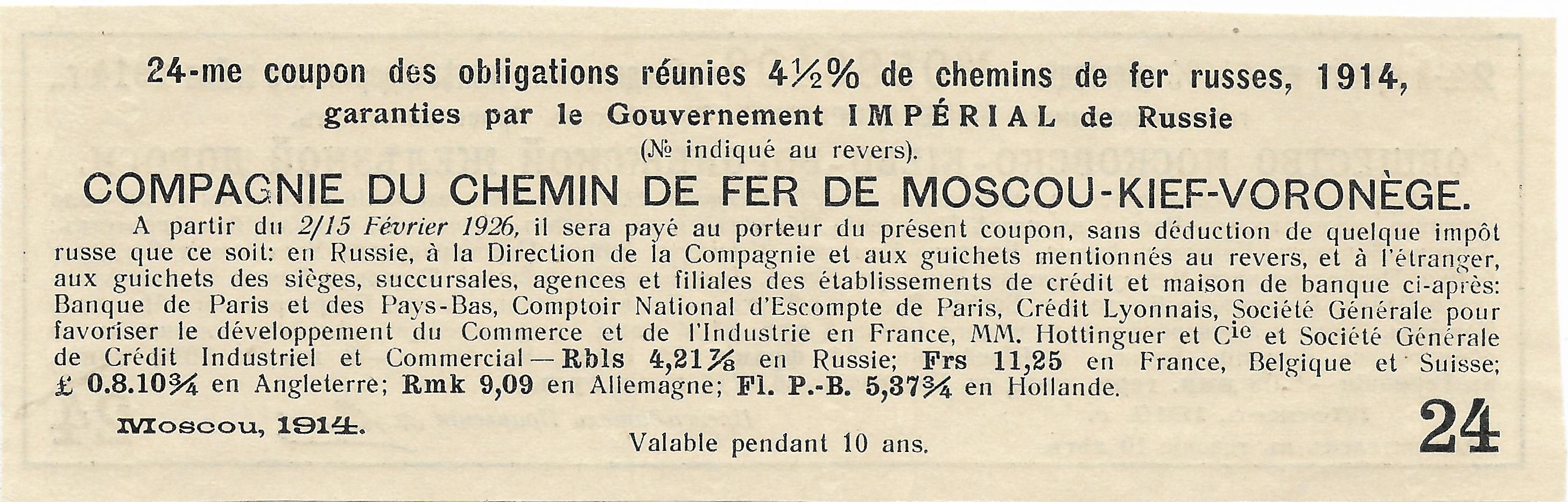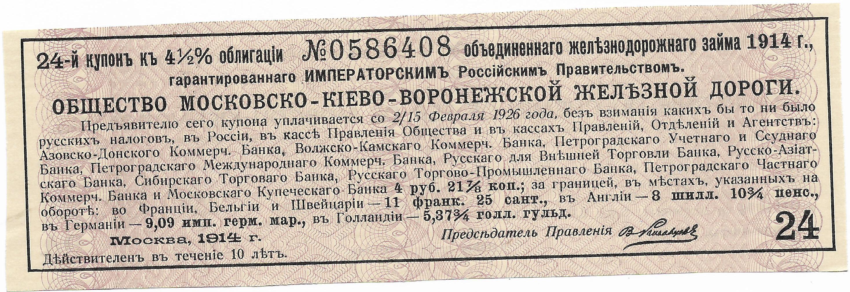 Купон облигации Московско-Киевско-Воронежской ЖД 1914 г. на сумму 4 руб. 21 7/8 коп.