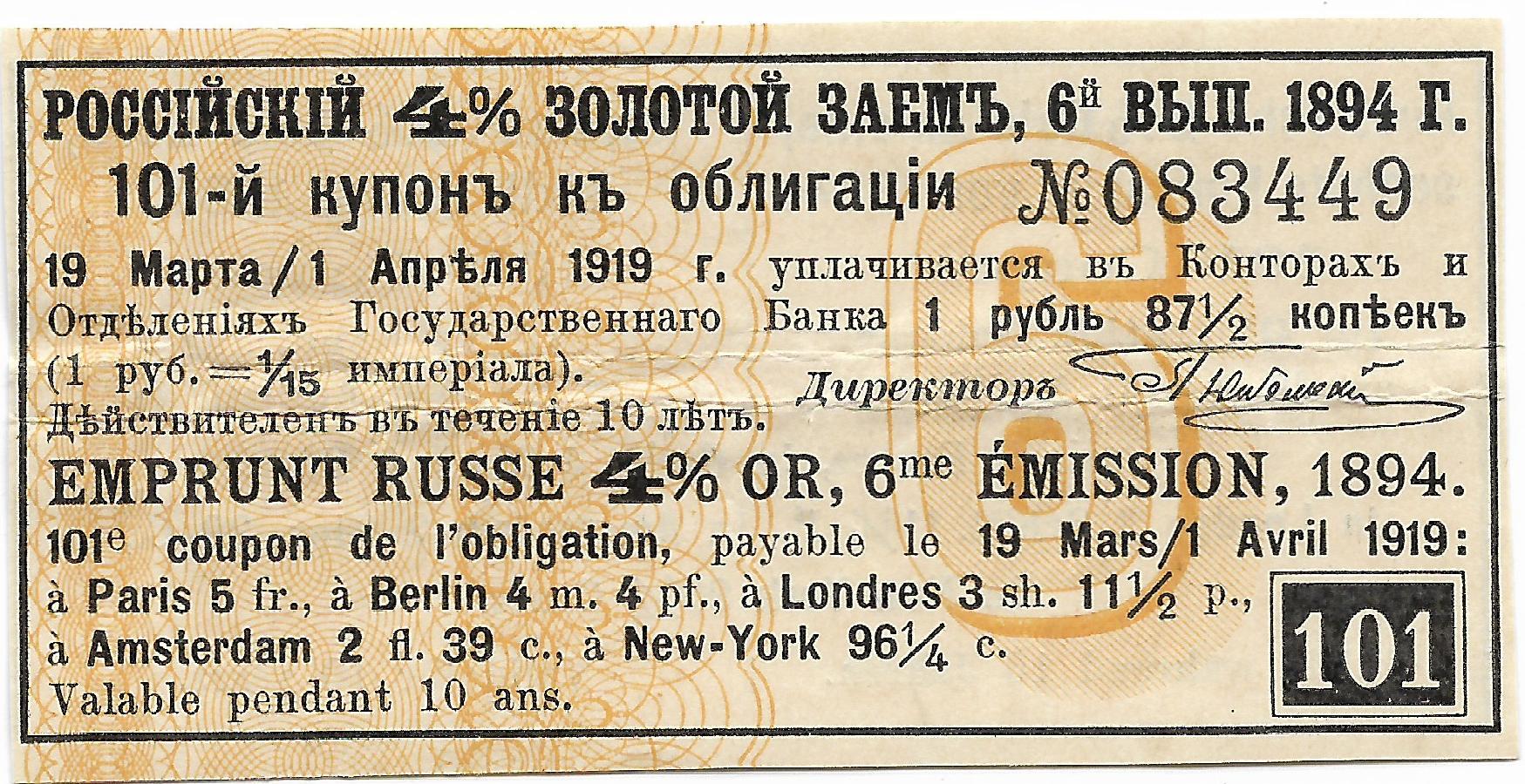 Купон облигации Российского 4% золотого займа 1894 г. на сумму 1 руб. 87 1/2 коп.