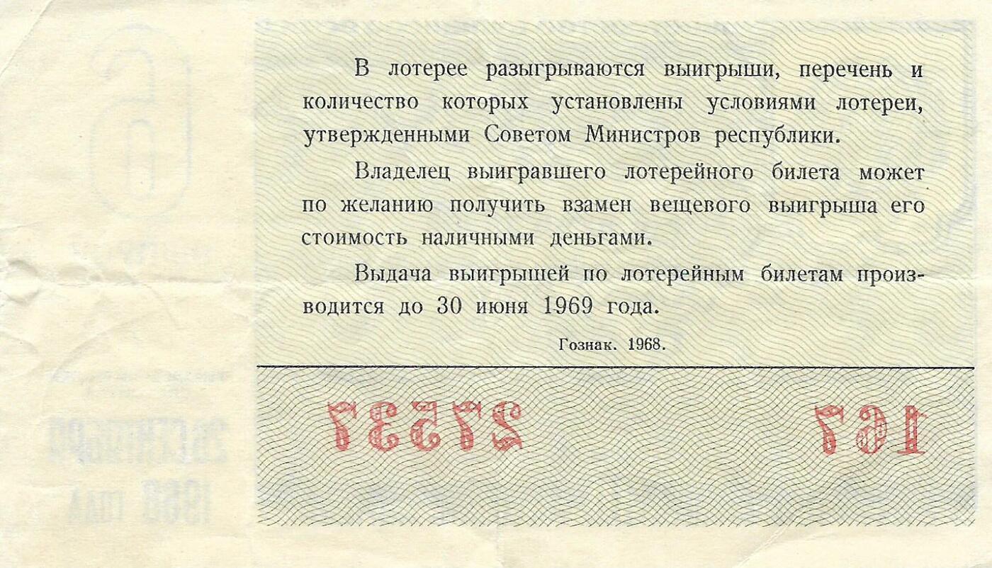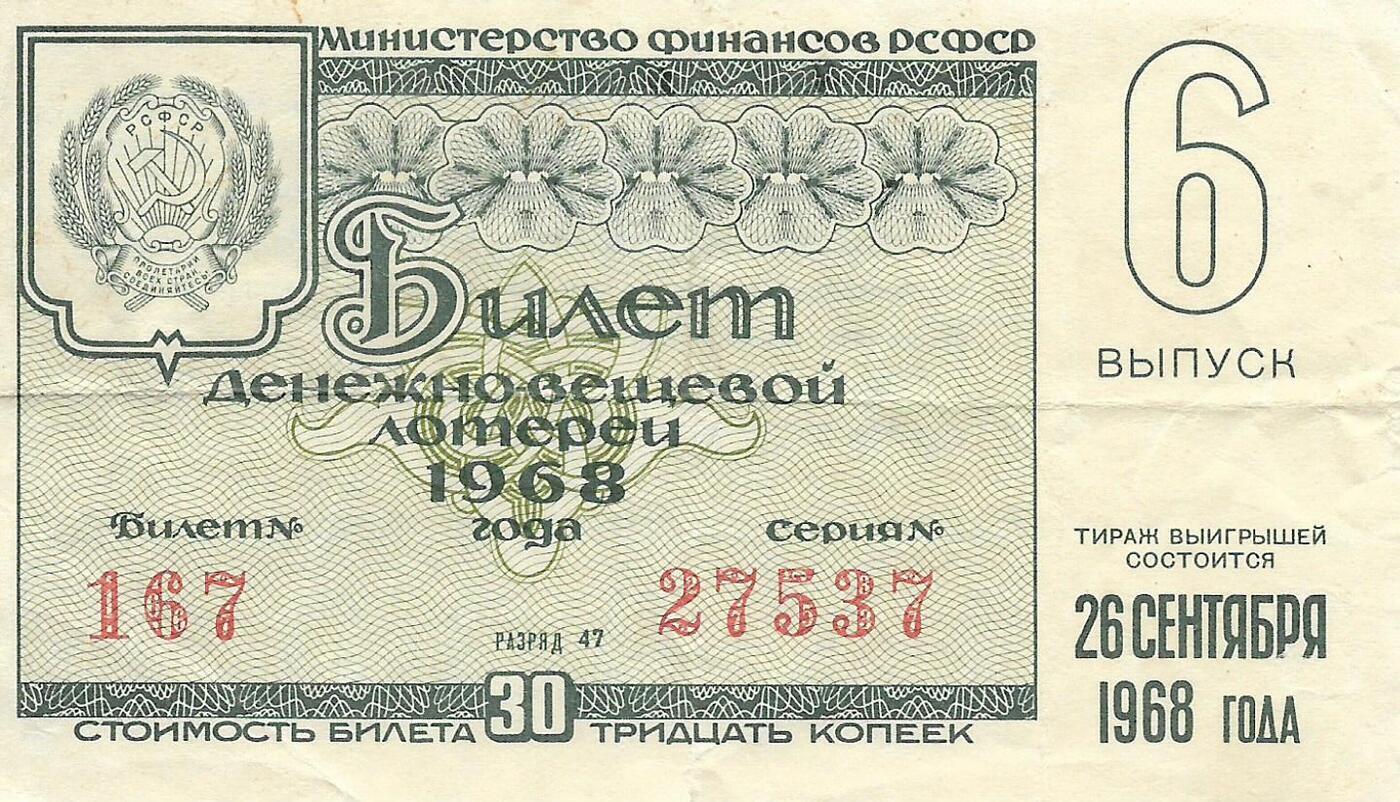 Билет денежно-вещевой лотереи 1968 г. 6 выпуск.