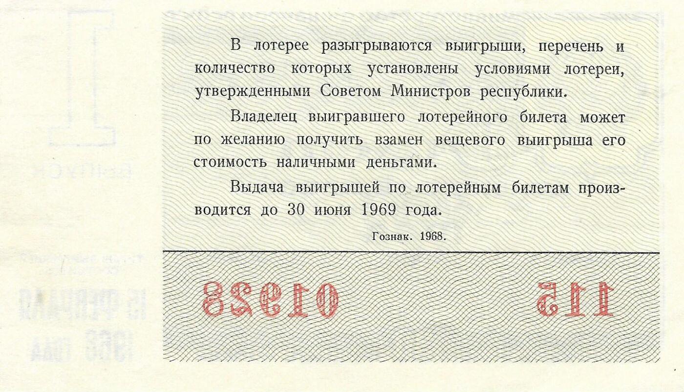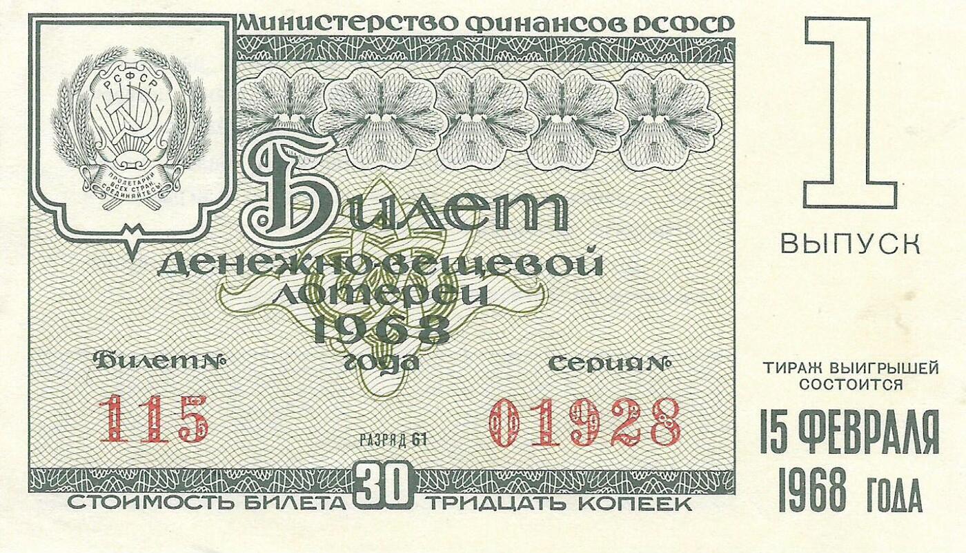 Билет денежно-вещевой лотереи 1968 г. 1 выпуск.