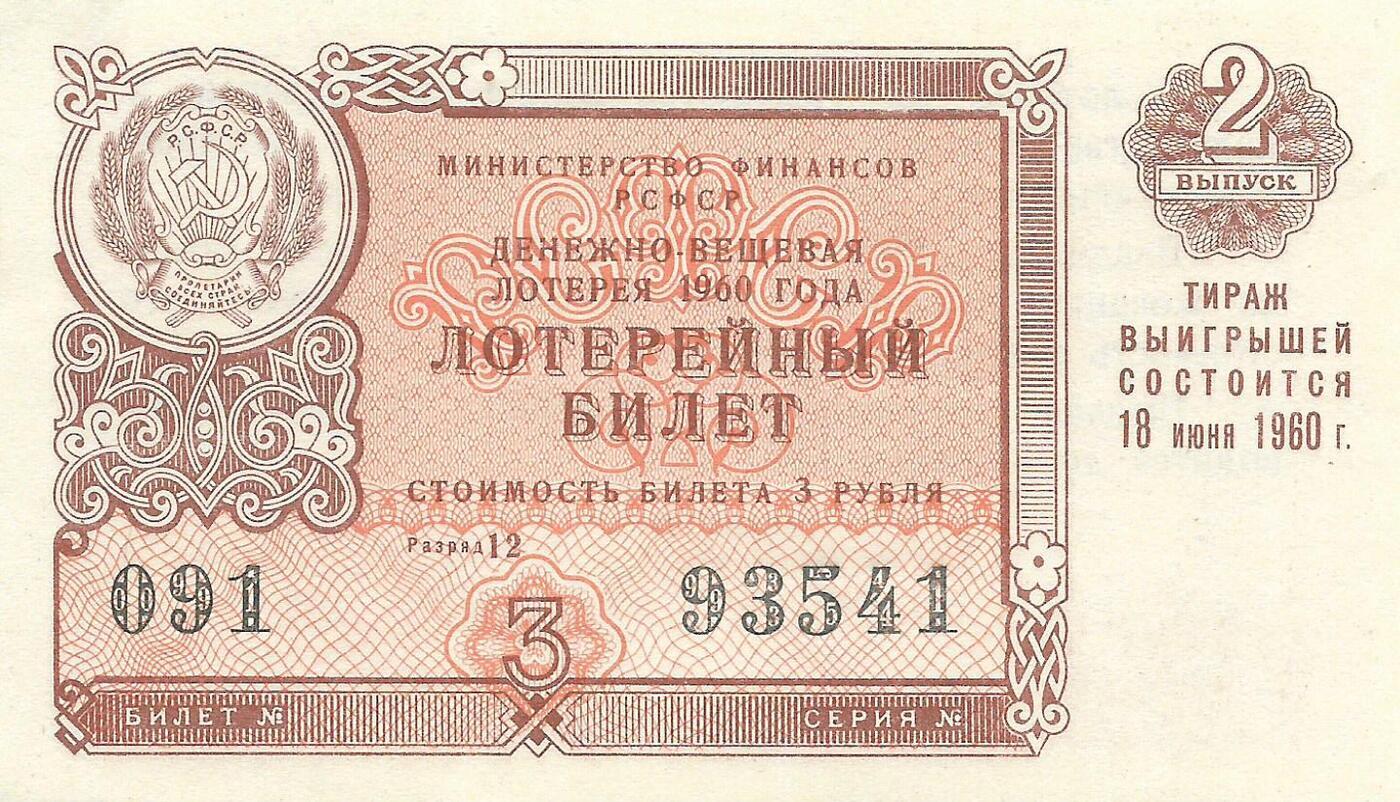 Лотерейный билет денежно-вещевой лотереи 1960 г. 2 выпуск.