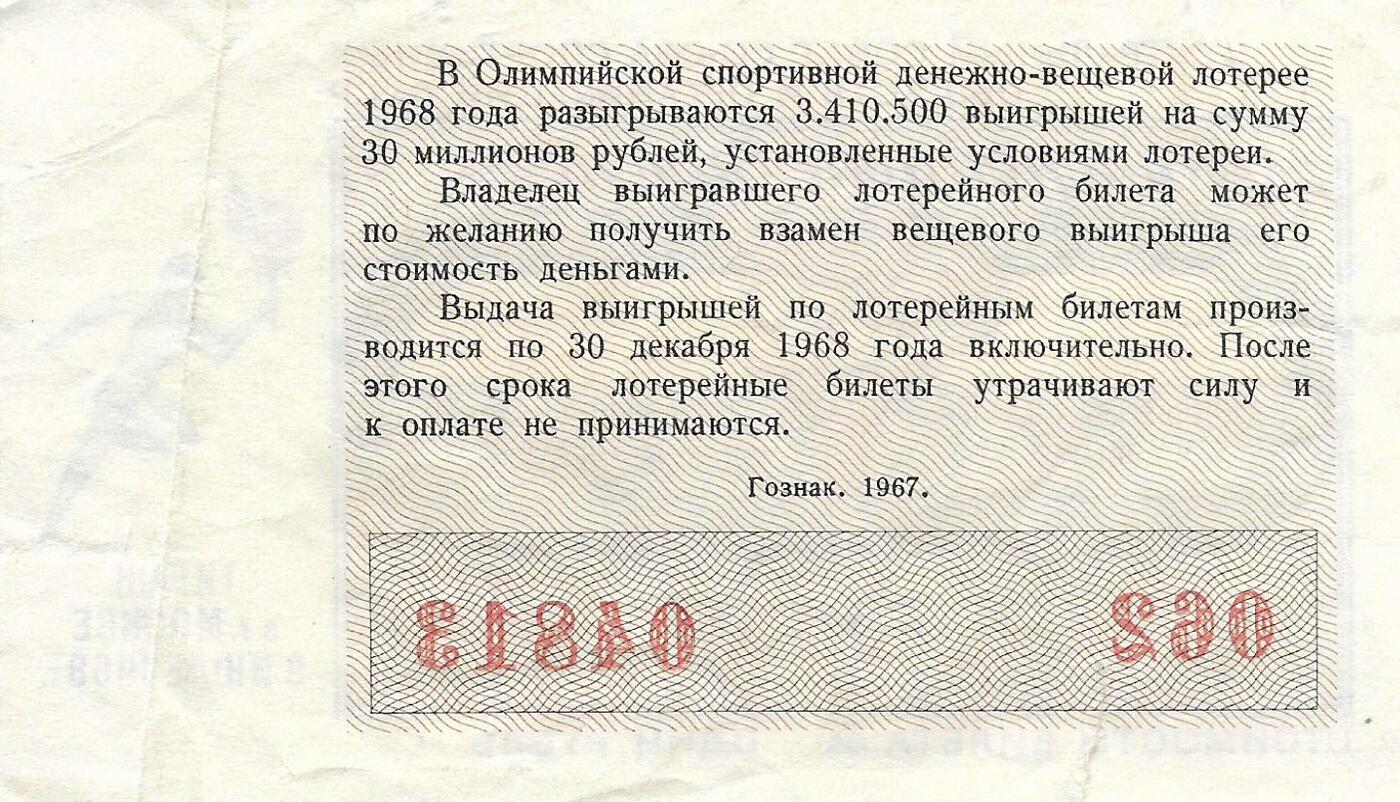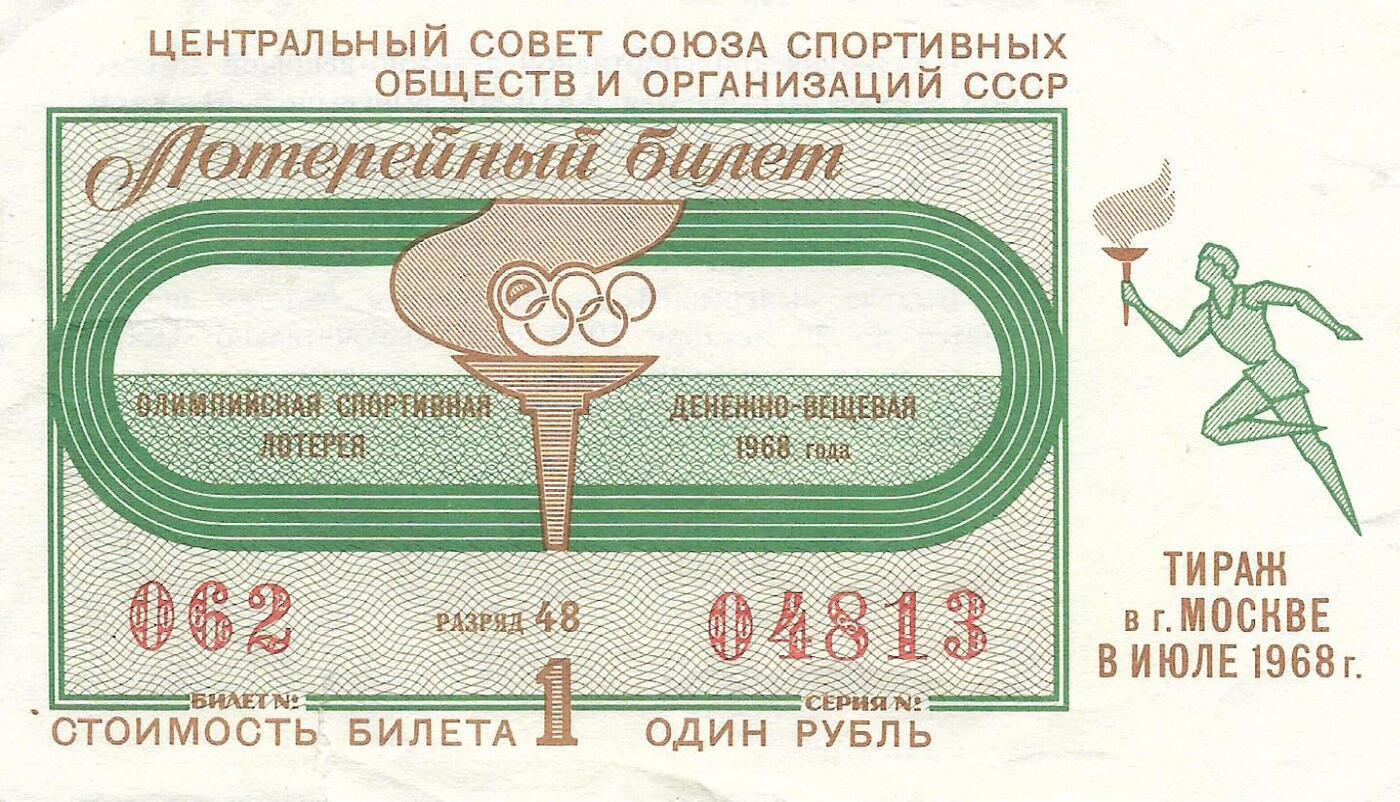 Лотерейный билет Олимпийской спортивной денежно-вещевой лотереи 1968 г.