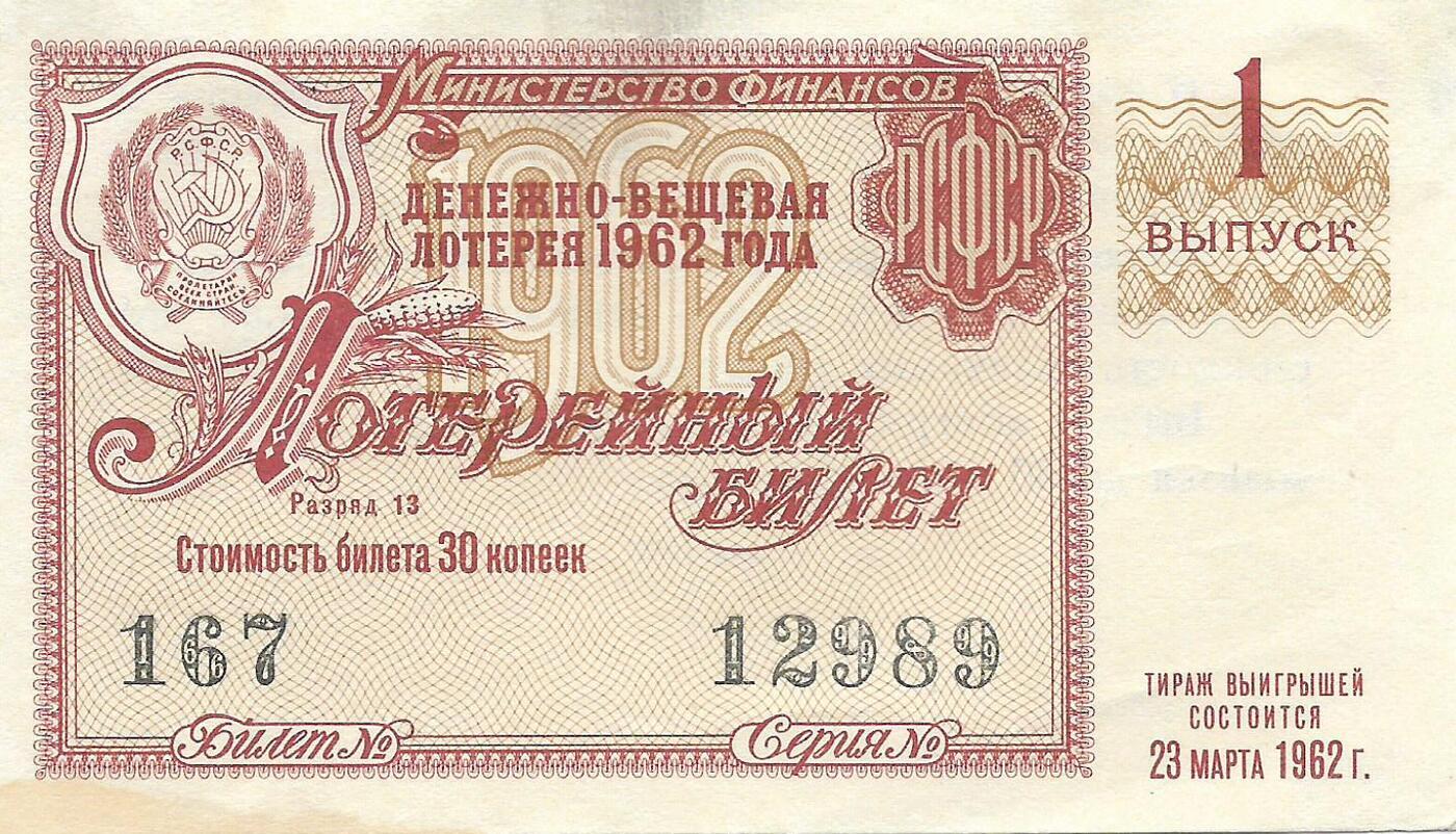 Лотерейный билет денежно-вещевой лотереи 1962 г. 1 выпуск.