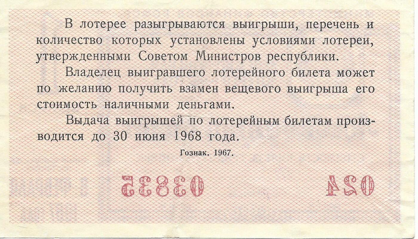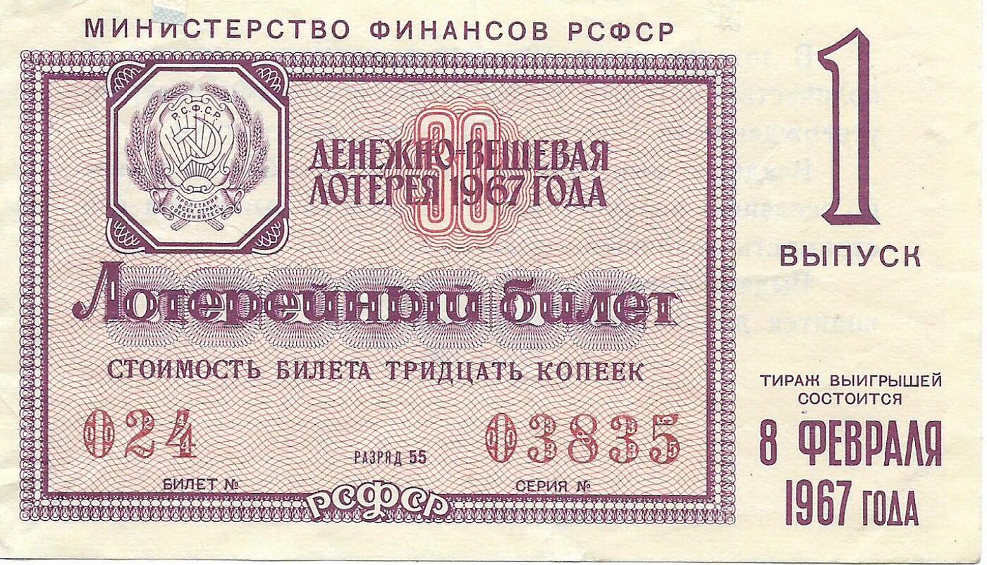 Билет денежно-вещевой лотереи 1967 г. 1 выпуск.