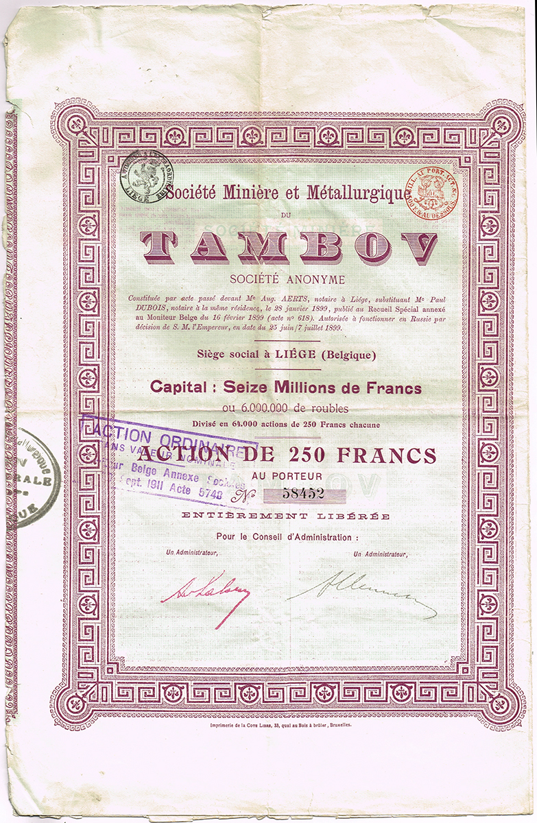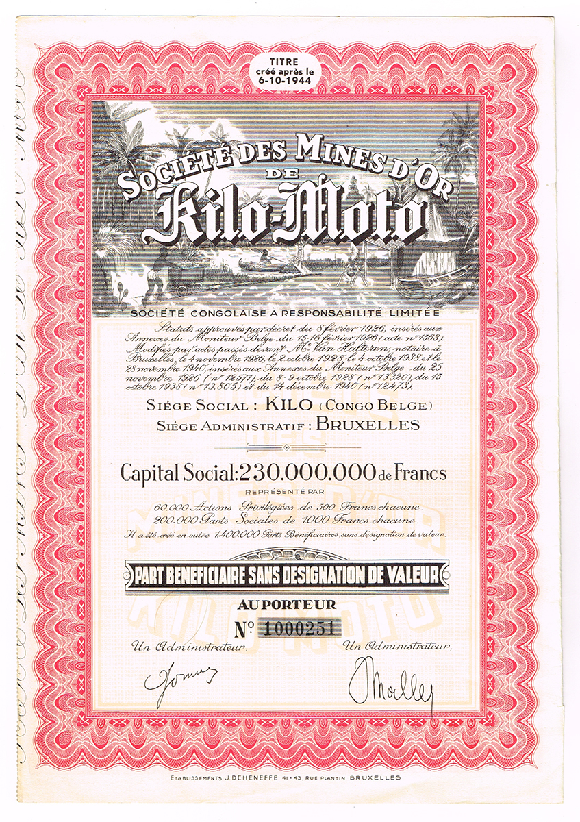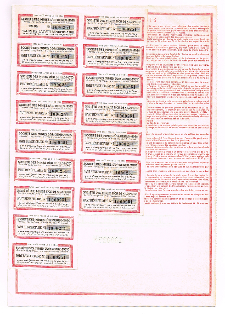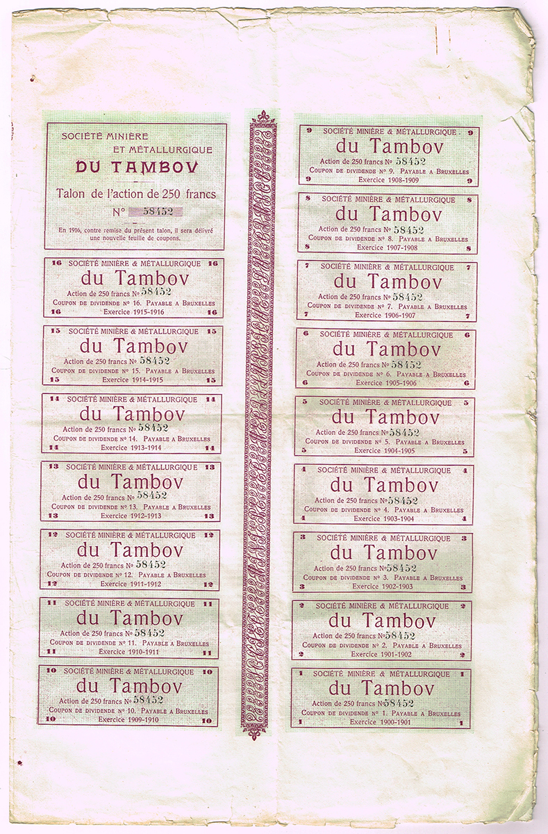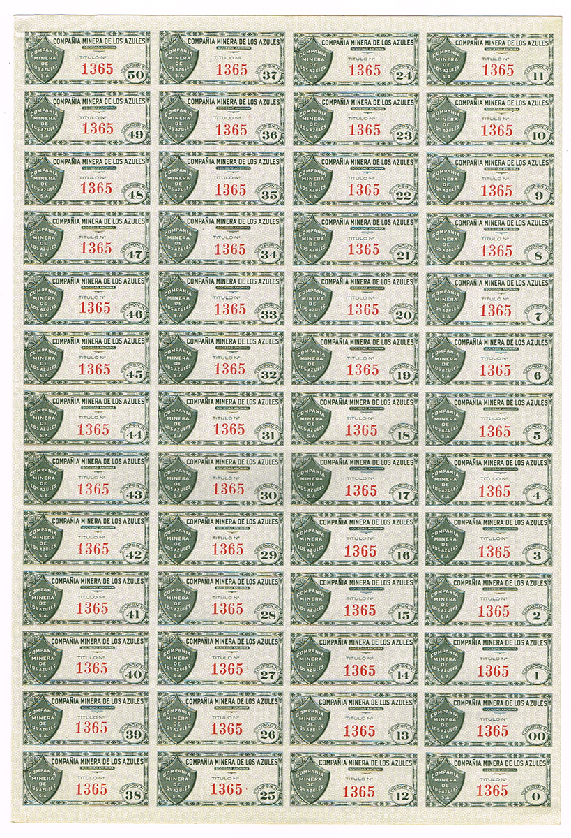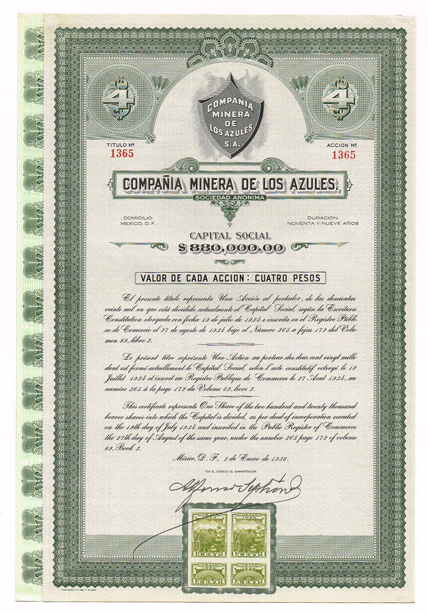 Ценная бумага Акция на 4 песо. Горнодобывающая компания Los Azules. С полным набором купонов. № 1365. Мексика, 1936 год