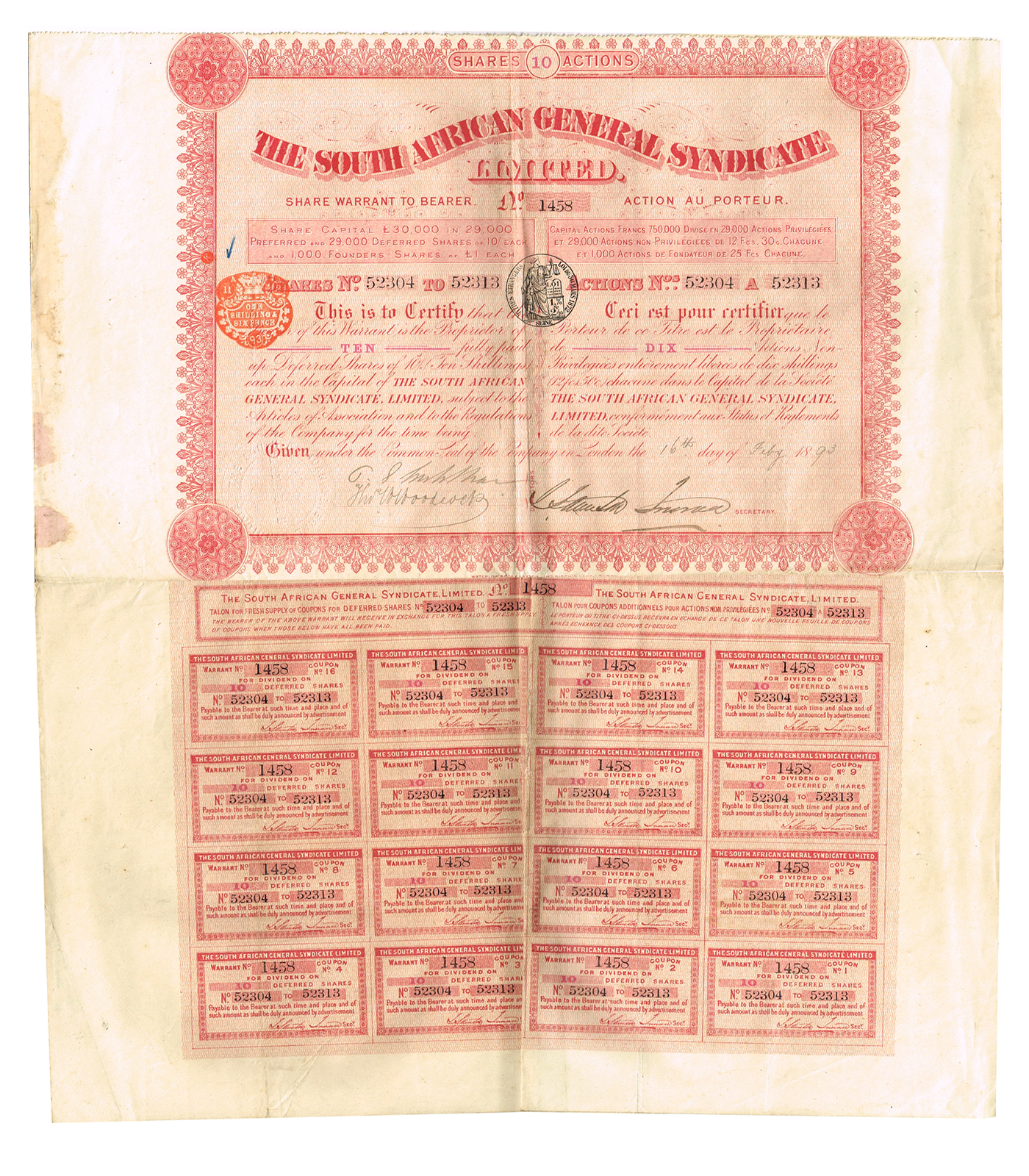 Ценная бумага Ордер на 10 акций по 10 шиллингов. Южноафриканский синдикат. ЮАР Великобритания, 1893 год. С купонами. № 1458