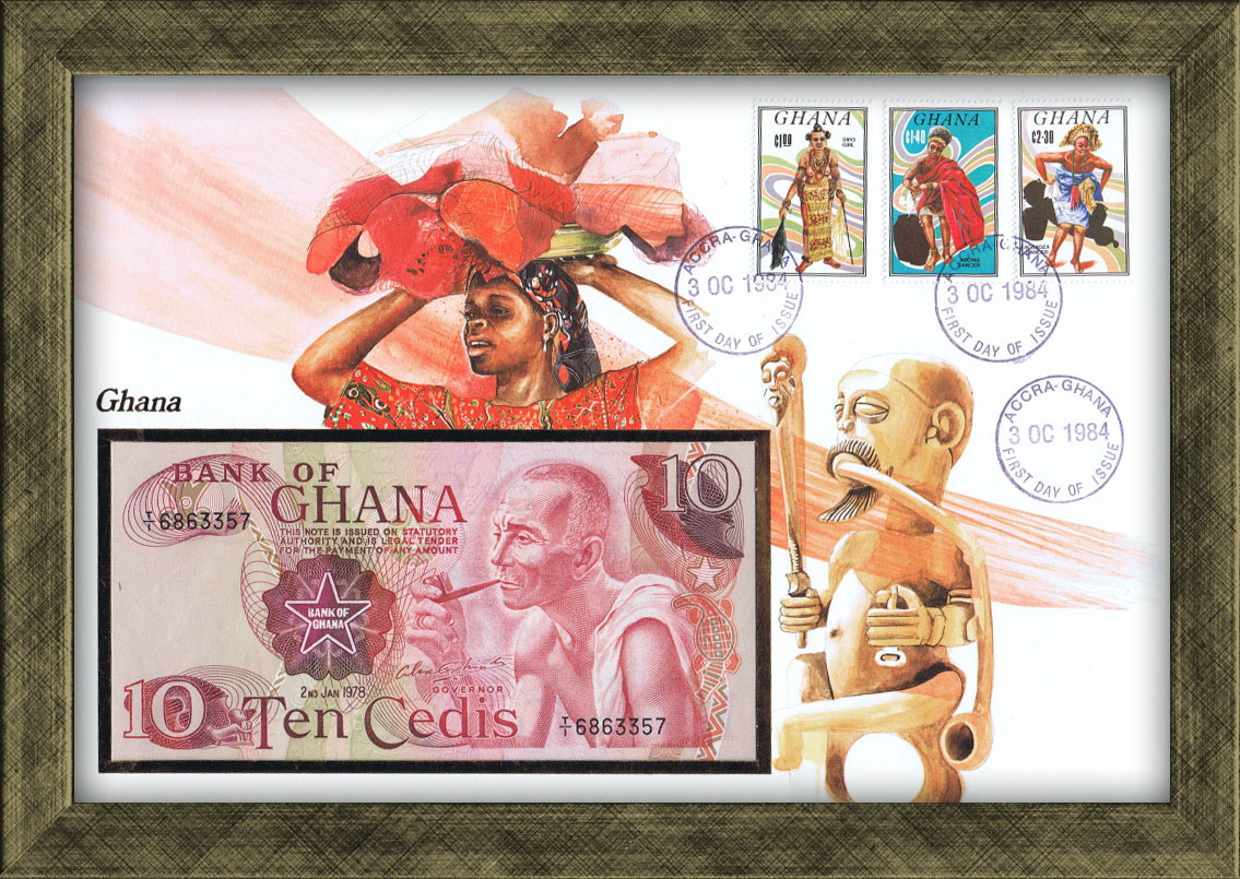 Гана: купюра, конверт, марки со спец. гашением. Коллекционный выпуск