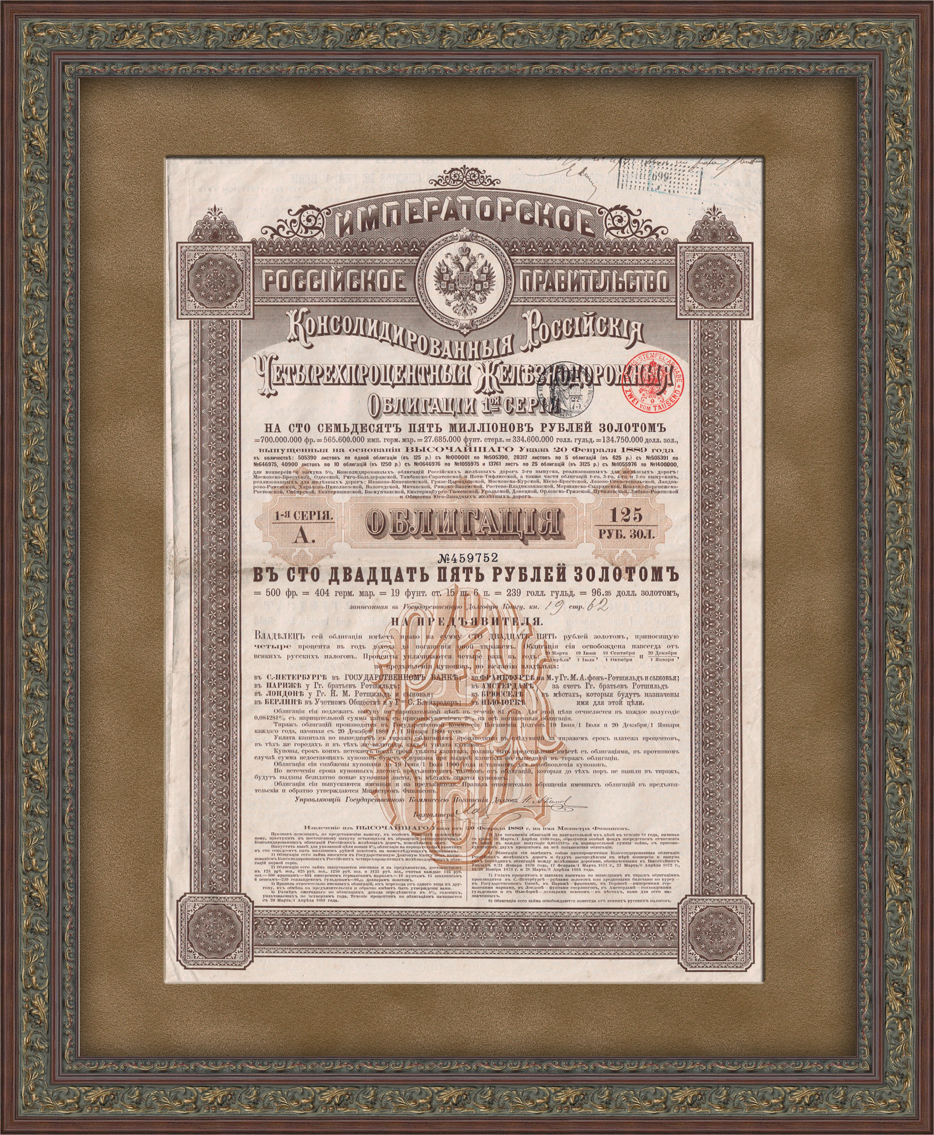 Консолидированная железнодорожная облигация в 4% в 125 рублей, 1889 год
