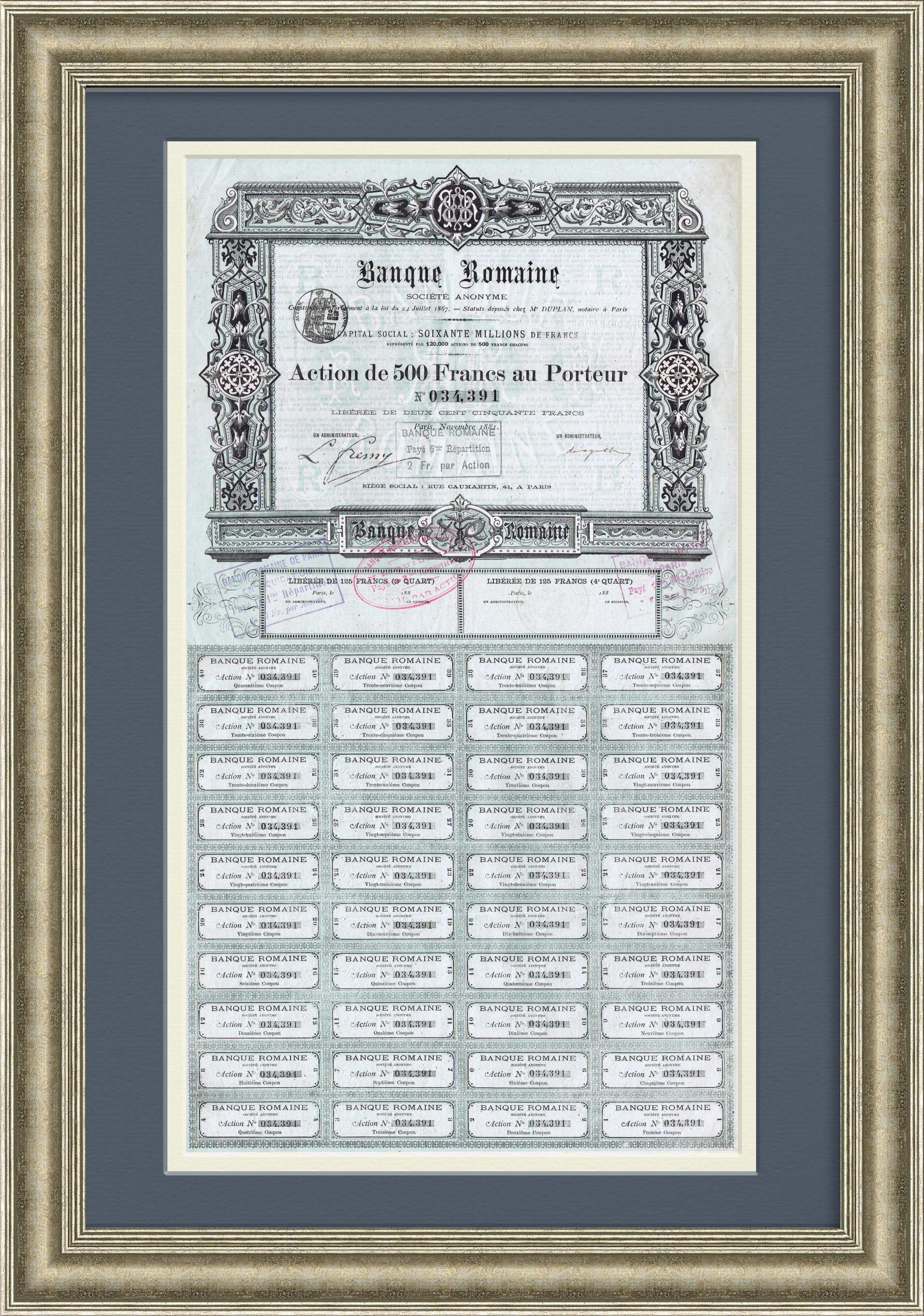 Акция банка 1881 года. Banque Romaine, привилегированная акция в 500 франков