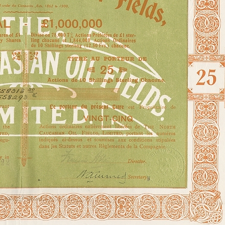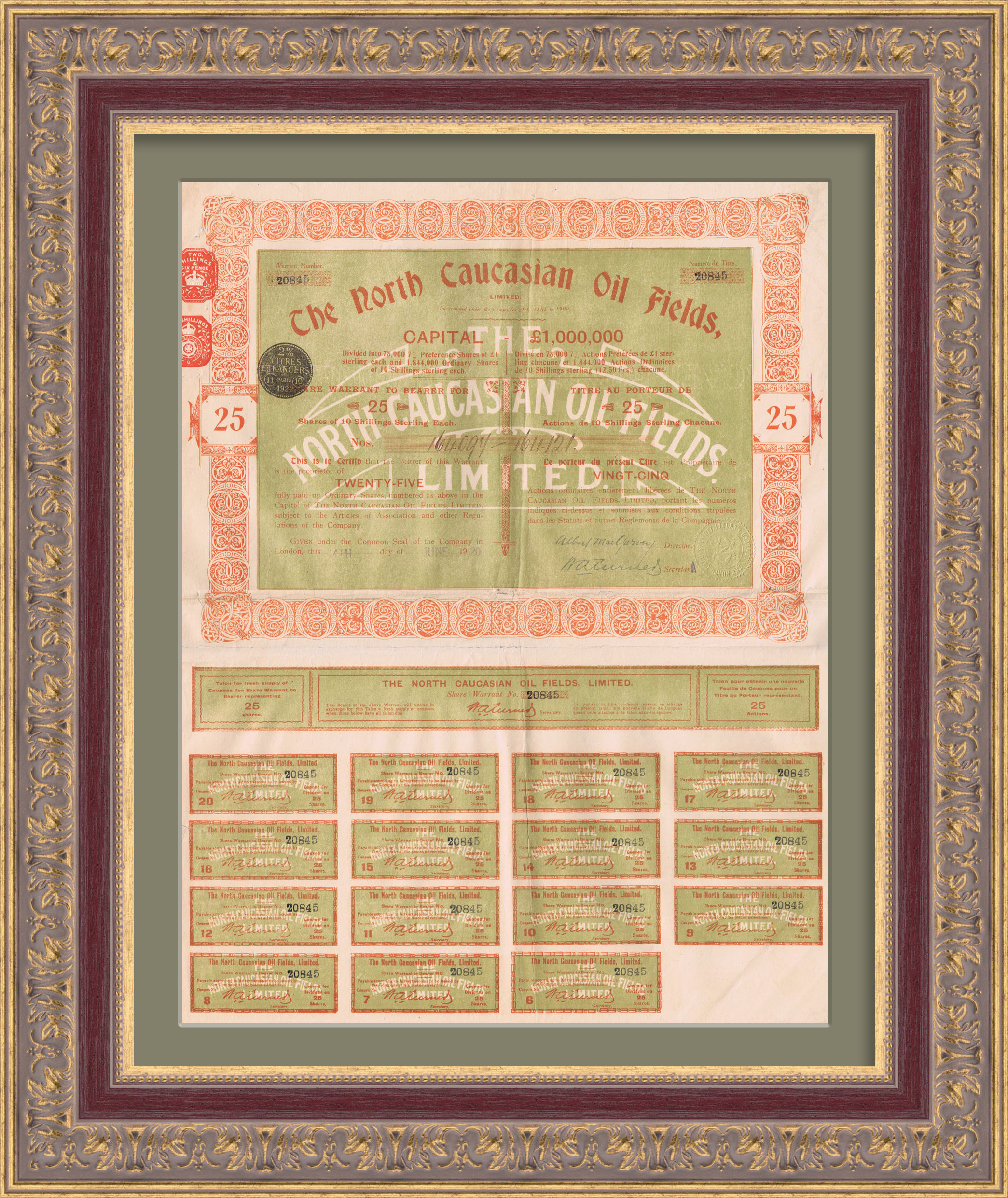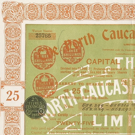 Северо-кавказское нефтяное месторождения на предъявителя, 1920 г. Сертификат на 25 акций
