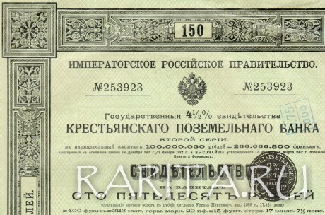 Свидетельство на капитал в 150 рублей Крестьянского Поземельного банка