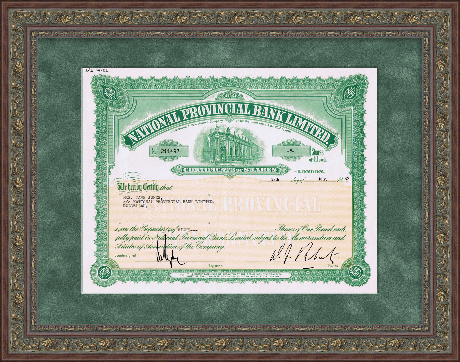 Великобритания: Национальный провинциальный банк, сертификат на 8 акций, 1962 год