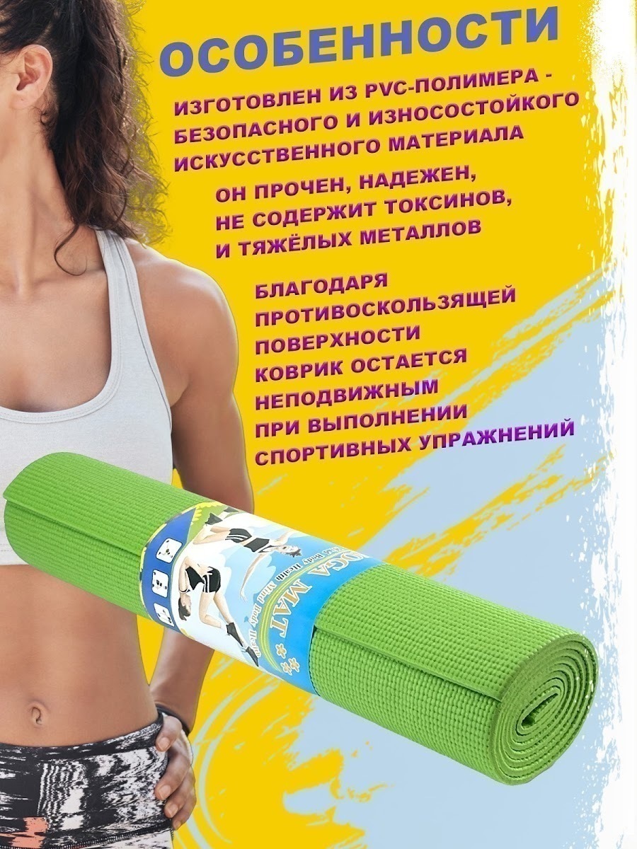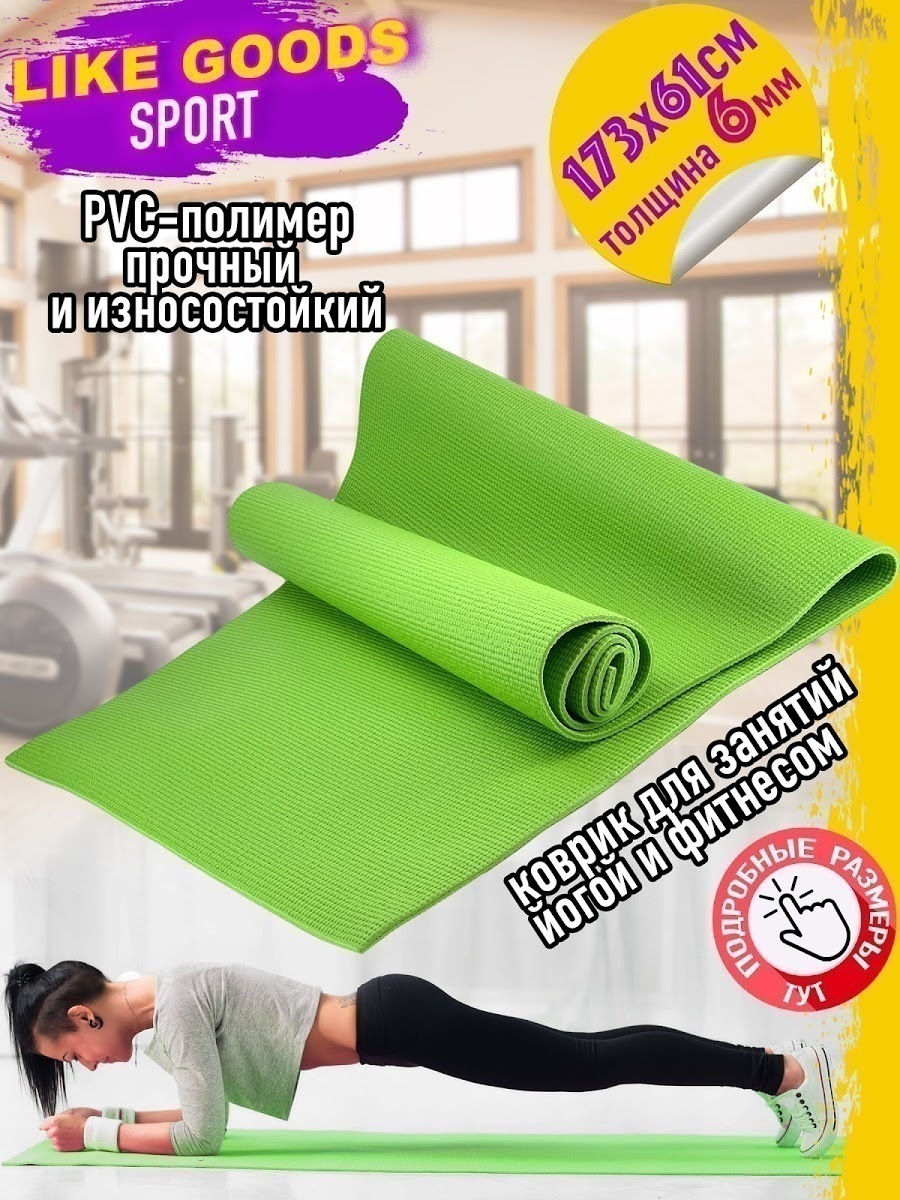 Коврик спортивный для фитнеса и йоги, Like Sport Mat, PVC, 173x61x0.6, M, Зеленый