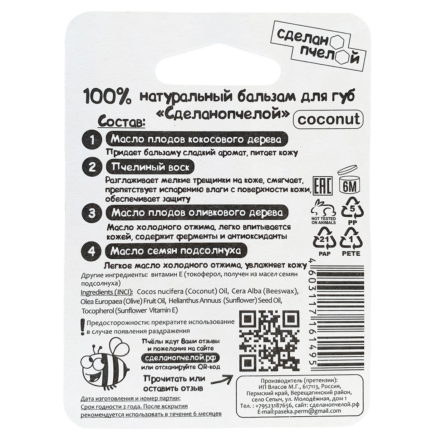 Сделанопчелой, На 100% натуральный бальзам для губ с пчелиным воском "COCONUT"
