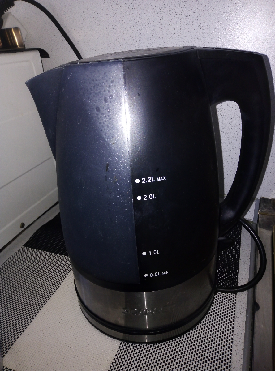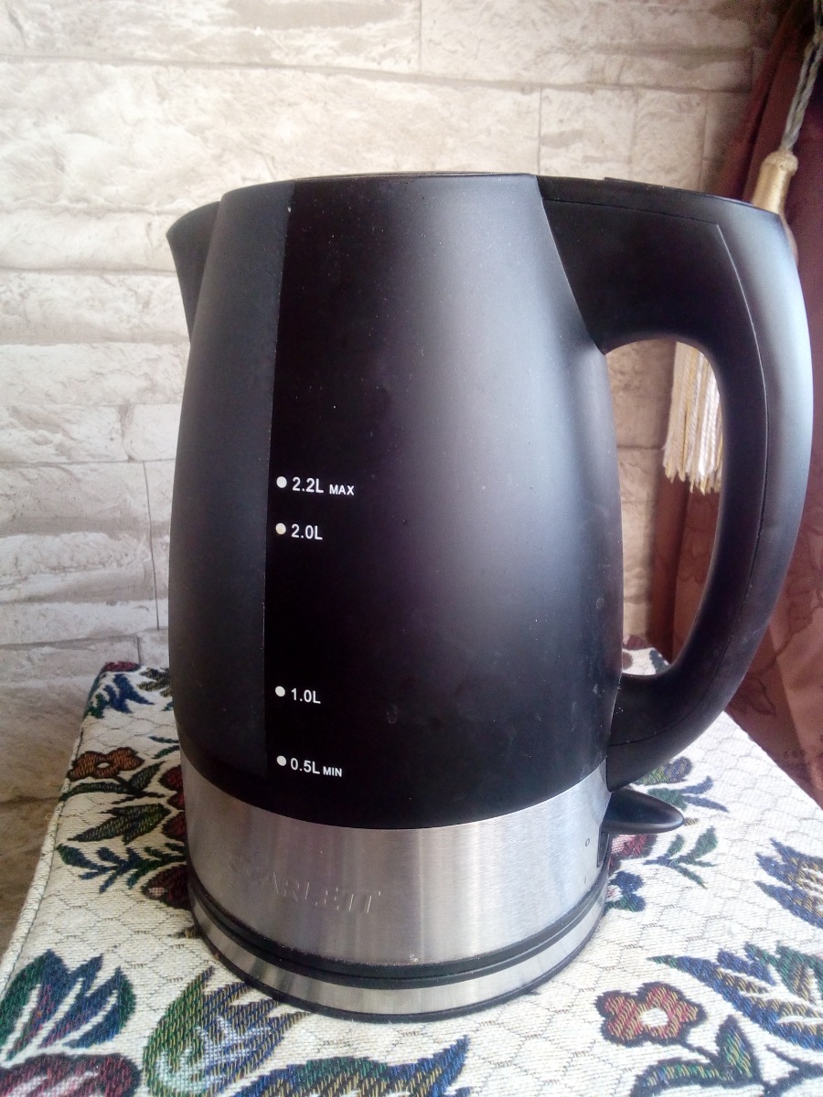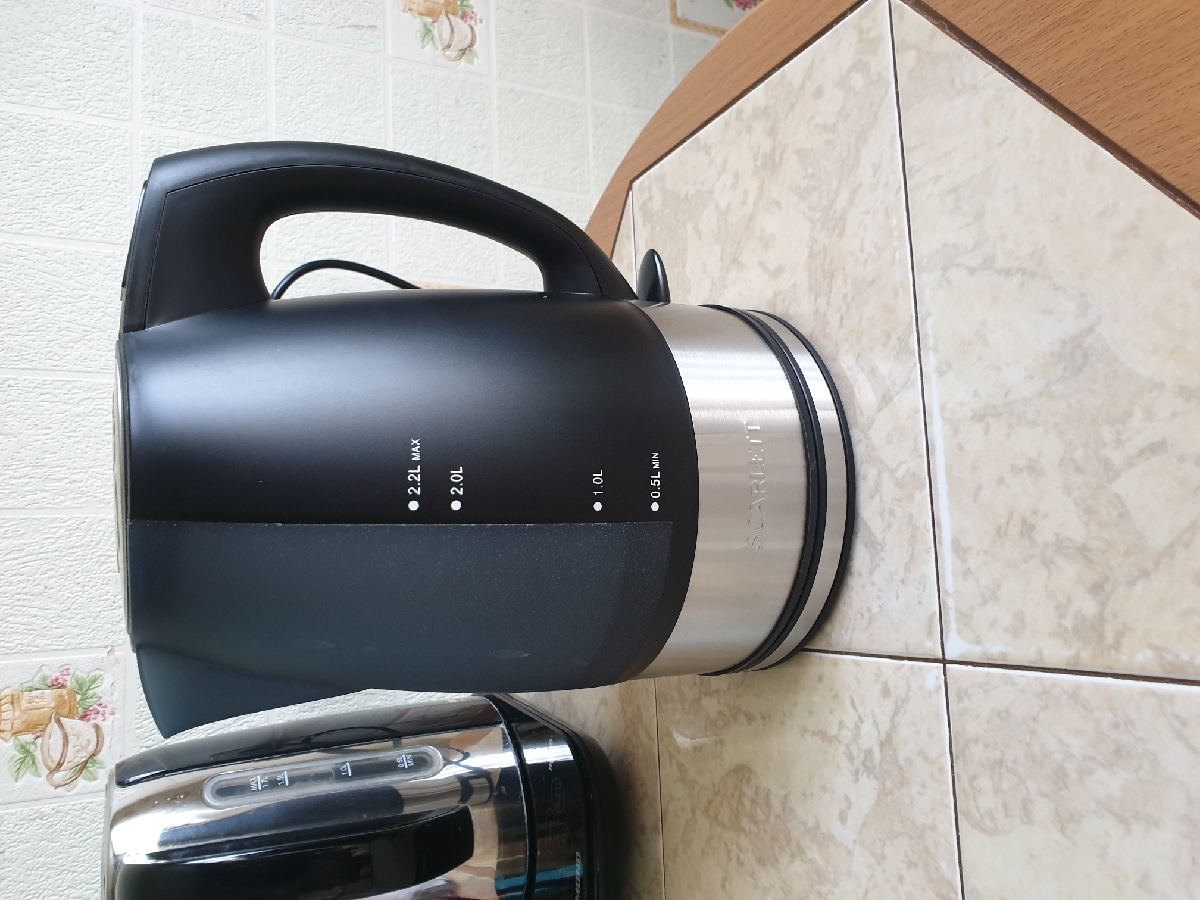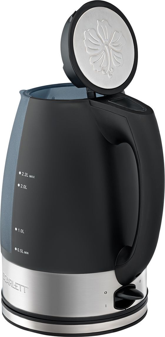 Электрический чайник Scarlett на подставке, 1850-2200Вт, 2.2л, пластик с металлической декорацией, SC-1020, черный