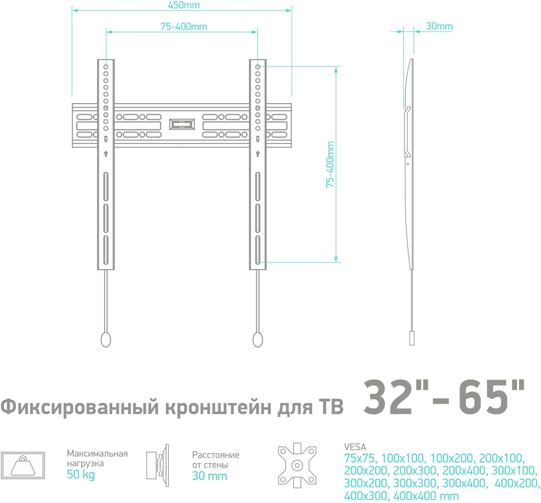 ONKRON кронштейн для телевизора 32"-65" фиксированный, чёрный FM2