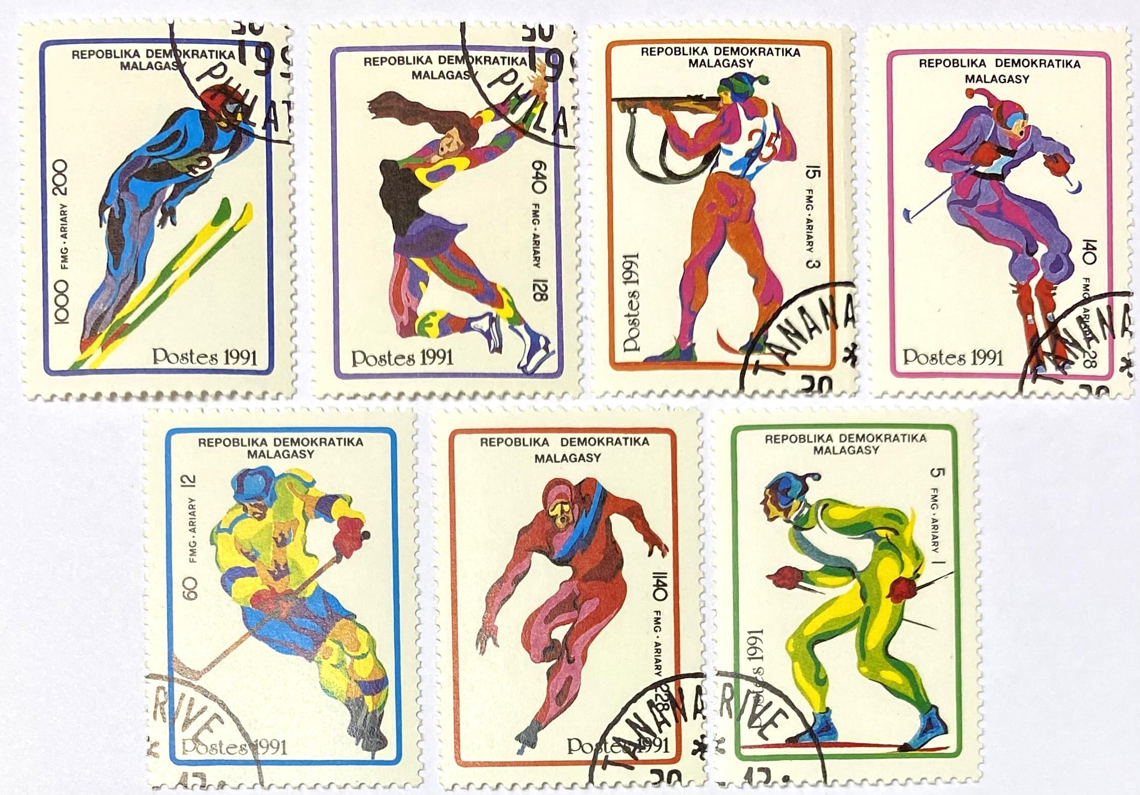 Зимние виды спорта. Зимние Олимпийские игры 1992 в Альбервиле (Франция). Серия из 7 марок. Почтовые марки. Мадагаскар, 1991 год.