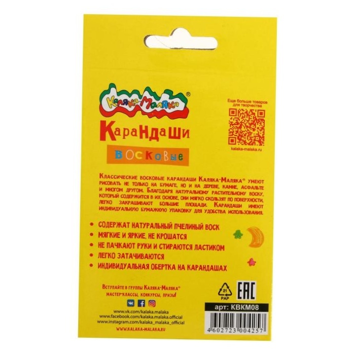 3 шт. Мелки восковые 8 цветов, Каляка-Маляка , круглые