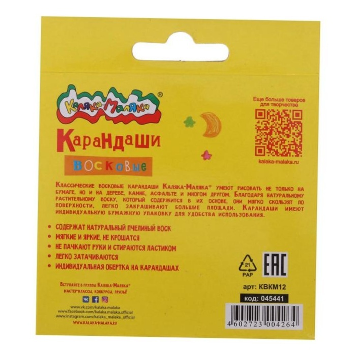 5 шт. Мелки восковые 12 цветов, Каляка-Маляка , круглые