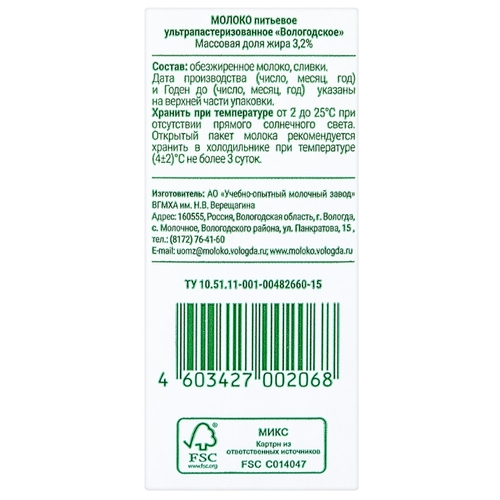 Молоко Из Вологды Вологодское ультрапастеризованное 3.2%, 1 л