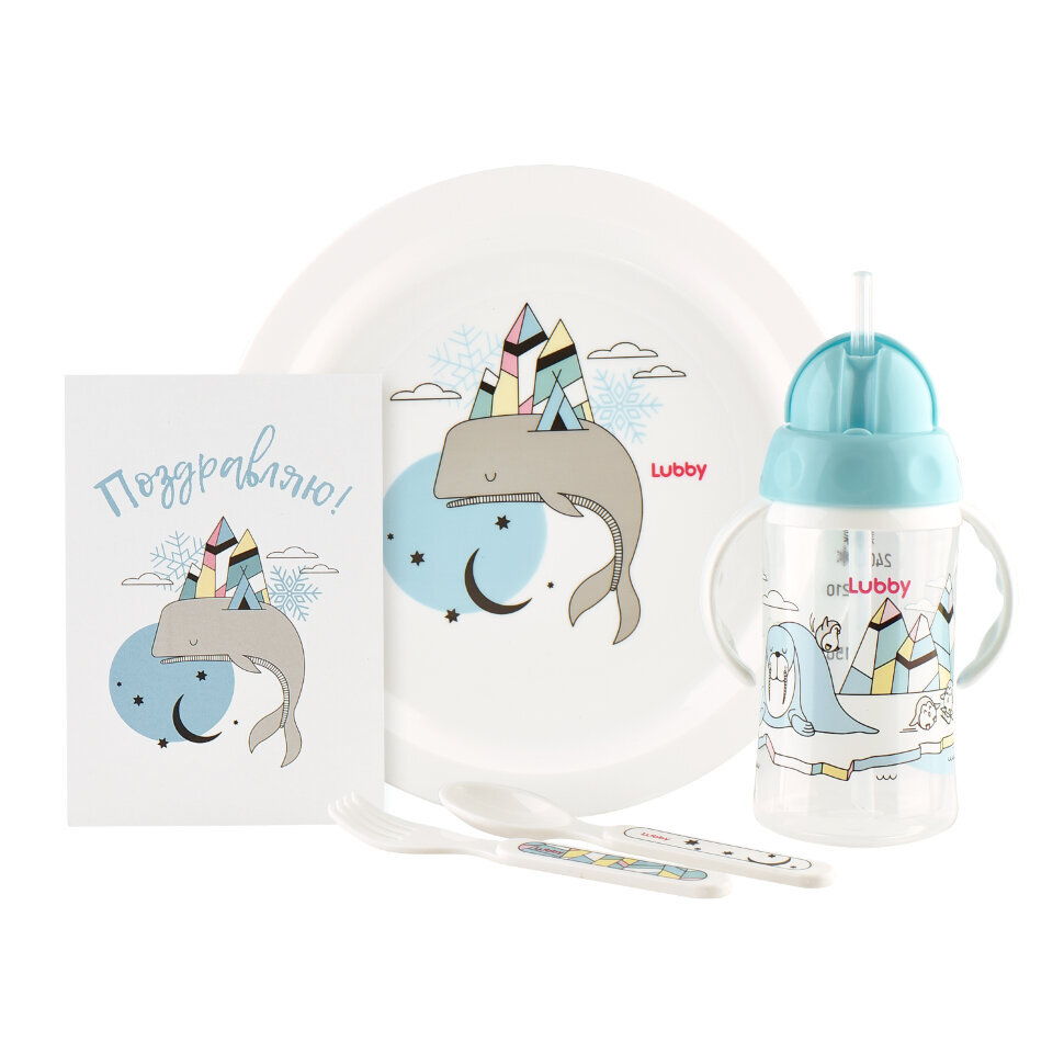 21386 LUBBY Набор посуды для кормления "Арктика"поильник, тарелка,приборы от 6 мес, полипроп